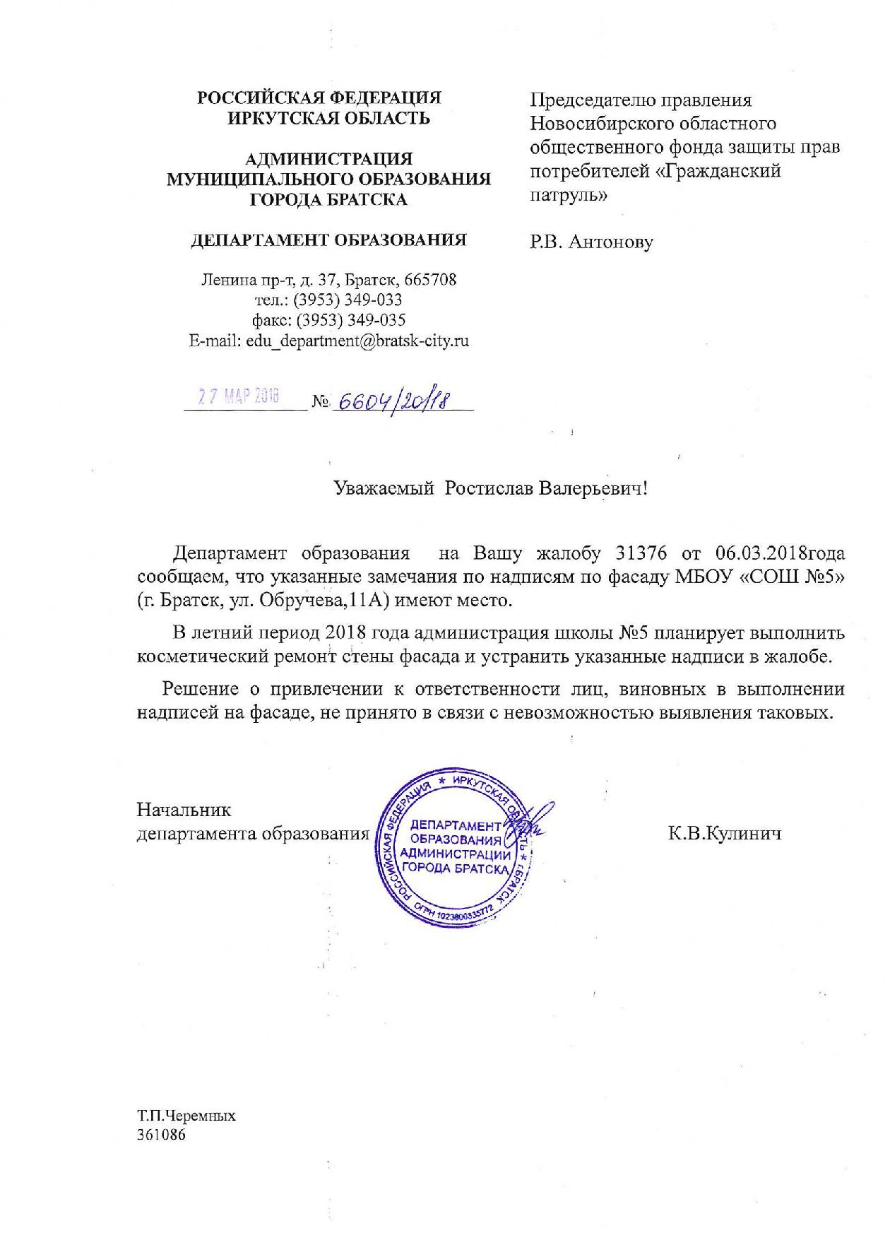 Номер жалобы:31376 Тип жалобы:Иные проблемы ЖКХ Название объекта:Адм Регион:Иркутская область Город:Братск Адрес:ул. Обручева, 11А Описание жалобы:Надписи на фасаде, неравномерная окраска. Статус: