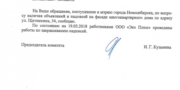 Номер жалобы:31263 Тип жалобы:Иные проблемы ЖКХ Название объекта:Управляющая Компания Регион:Новосибирская область Город:Новосибирск Адрес:ул. Щетинкина, 34 Описание жалобы:Надписи на фасаде Статус: