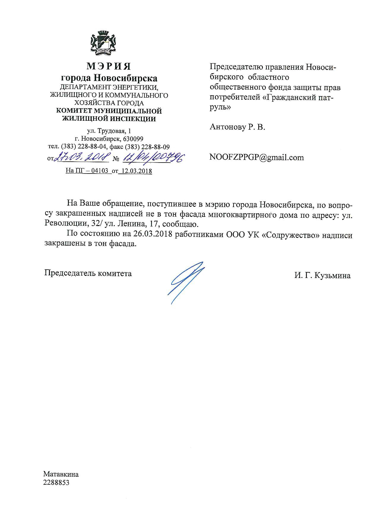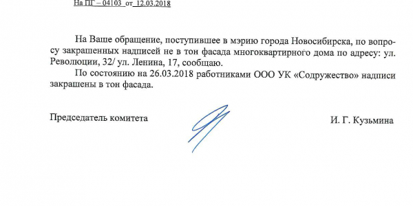 Номер жалобы:31234 Тип жалобы:Иные проблемы ЖКХ Название объекта:Управляющая Компания Регион:Новосибирская область Город:Новосибирск Адрес:ул. Революции, 32 Описание жалобы:Надписи закрашены не в тон Статус: