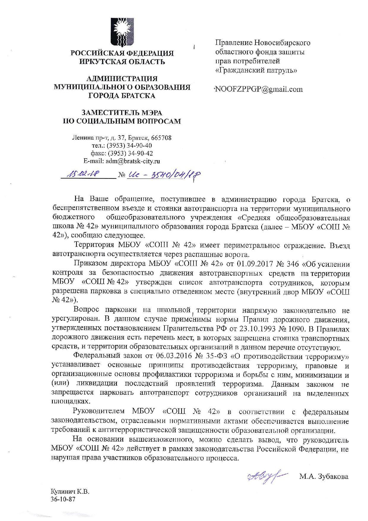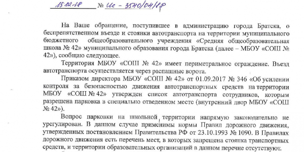 Номер жалобы:29267 Тип жалобы:Прочее Название объекта:Прокуратура Регион:Иркутская область Город:Братск Адрес:ул. Крупской, 39 Описание жалобы:Стоянка и движение автомобилей по территории школы 42. Нарушение СанПиН и антитеррористического законодательства Статус: