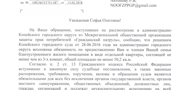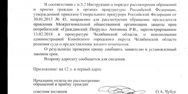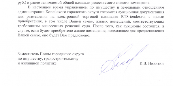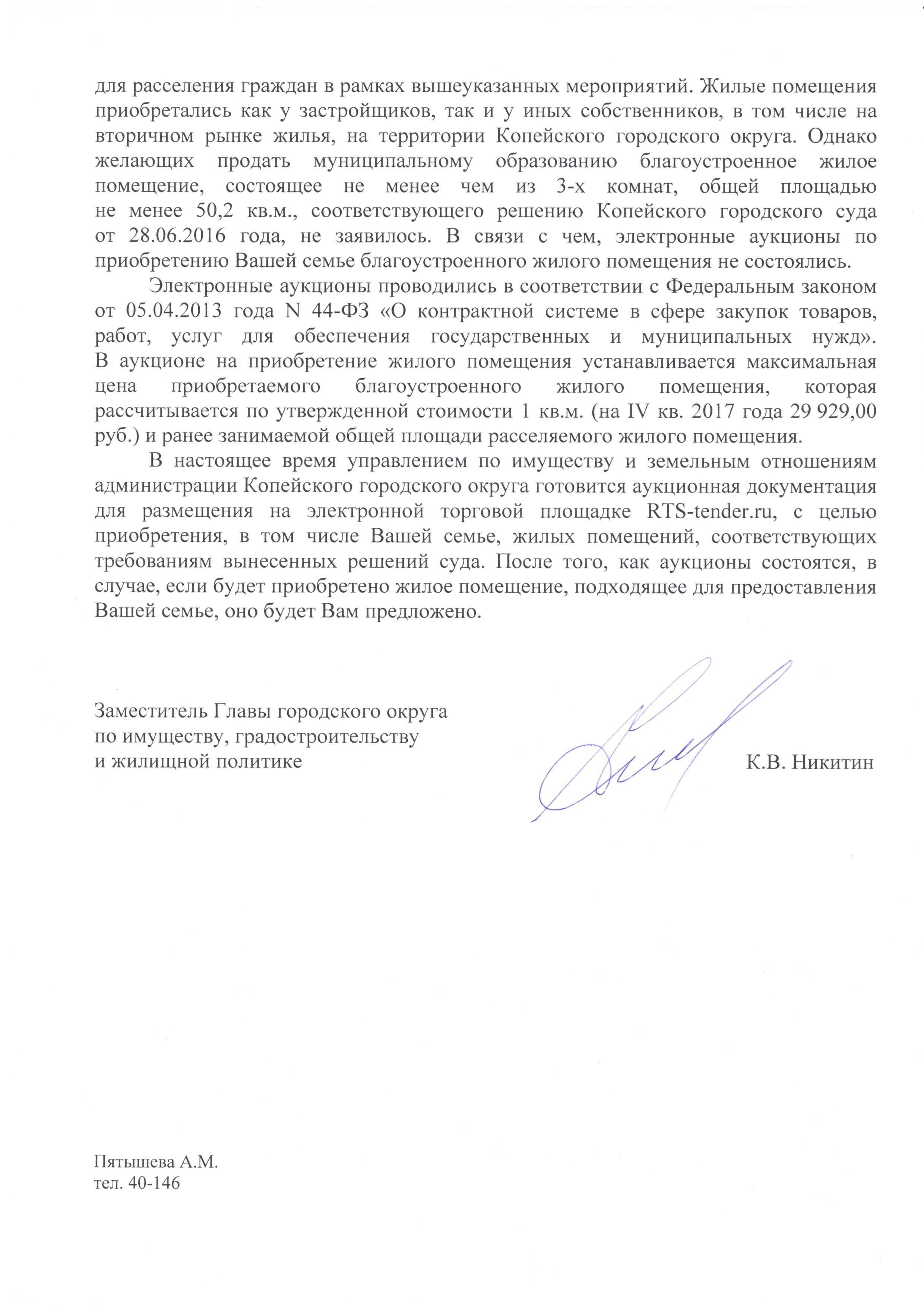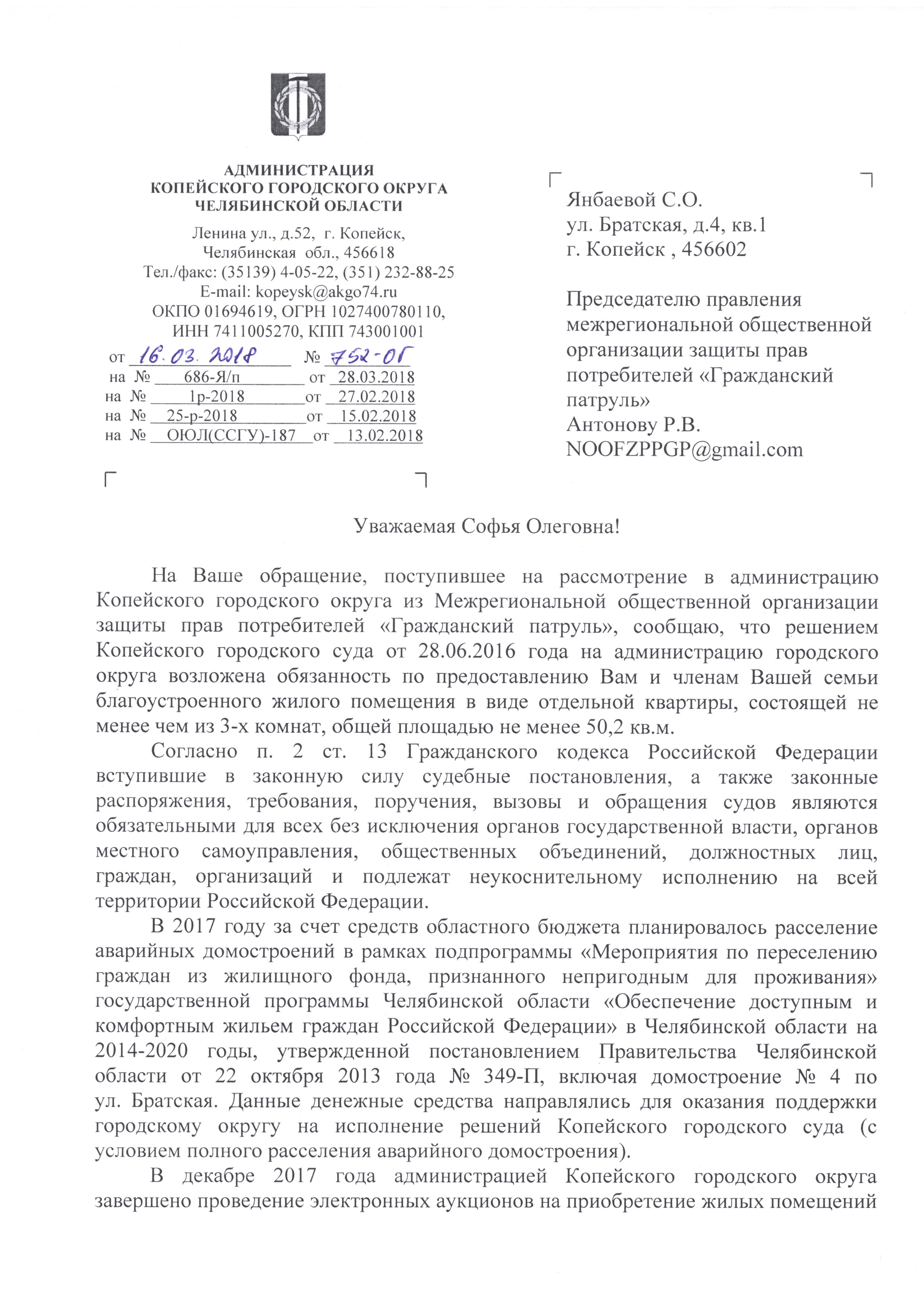Номер жалобы:29201 Тип жалобы:Прочее Название объекта:Администрация Копейского Городского Округа Регион:Челябинская область Город:Копейск Адрес:Братская ул., 4 Описание жалобы:Злостное уклонение исполнения решения суда о предоставлений жилого помещения взамен аварийного . Статус: