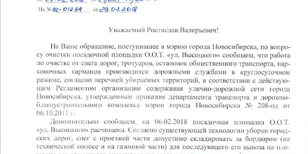 Номер жалобы:29216 Тип жалобы:Прочее Название объекта:Городская Служба Регион:Новосибирская область Город:Новосибирск Адрес:ул. Высоцкого, 38 Описание жалобы:Не очищена от ранее убранного снега посадочная площадка остановки «ул.Высоцкого» Статус: