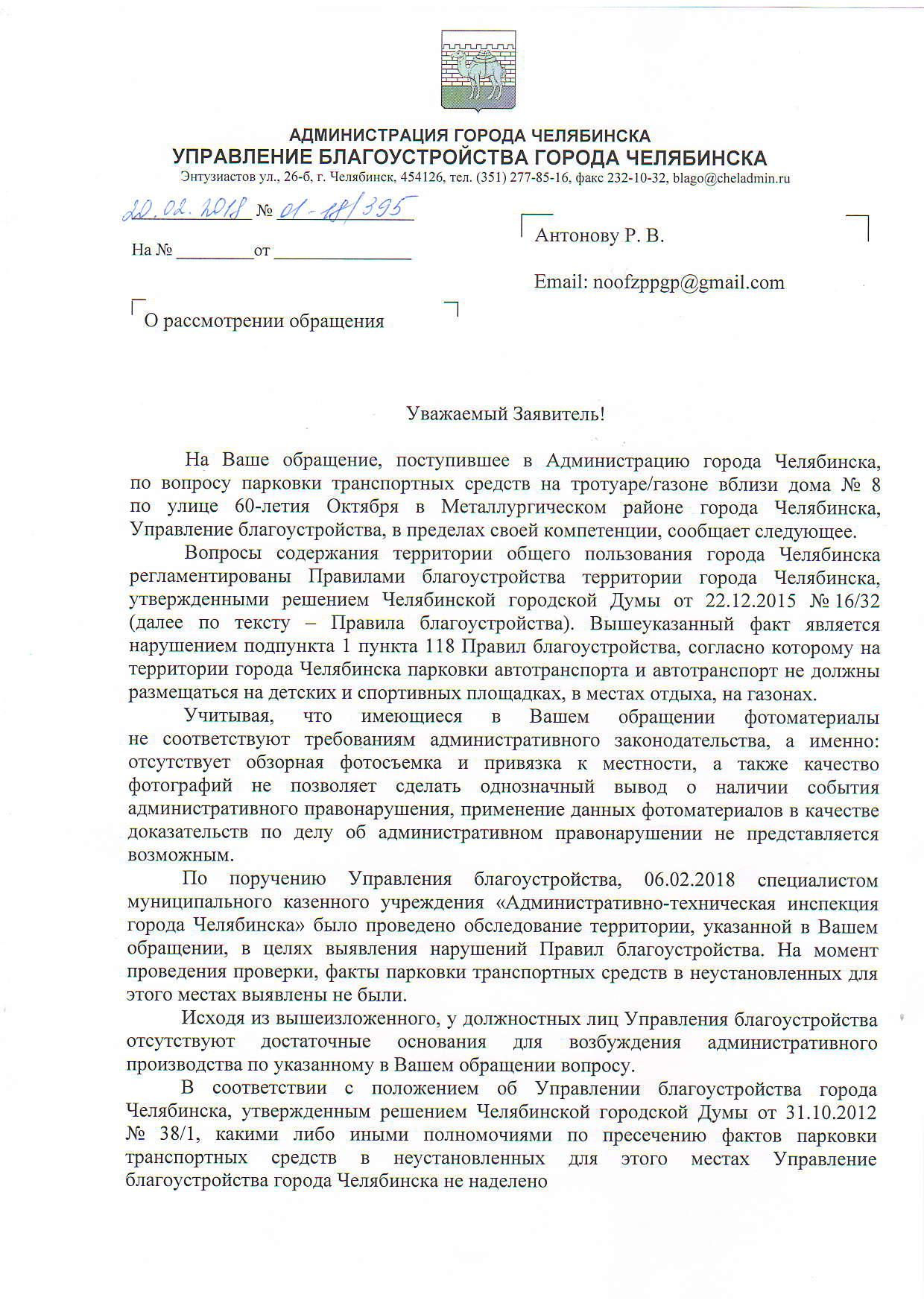 Согласно Статье 3. Закона Челябинской области от 27.05.2010 584 «Об административных правонарушениях в Челябинской области»: "Нарушение муниципальных нормативных правовых актов в области охраны окружающей среды, в сфере благоустройства и озеленения территорий и обращения с отходами производства и потребления, принятых в пределах полномочий органов местного самоуправления, - влечет предупреждение или наложение административного штрафа на граждан в размере от одной тысячи до пяти тысяч рублей; на должностных лиц - от десяти тысяч до пятидесяти тысяч рублей; на юридических лиц - от тридцати тысяч до одного миллиона рублей." Инструкция по созданию и содержанию зеленых насаждений в городе Челябинске, утвержденная постановлением Главы города Челябинска от 02.12.2004 2200-п "Об утверждении инструкции по созданию и содержанию зеленых насаждений в городе Челябинске" является муниципальным нормативным правовым актом. Выше были представлены 4 факта нарушения данной инструкции, что соответствует Статье 3 Закона Челябинской области от 27.05.2010 584 «Об административных правонарушениях в Челябинской области». Прошу привлечь к административной ответственности подрядчика или граждан, совершивших данные нарушения.