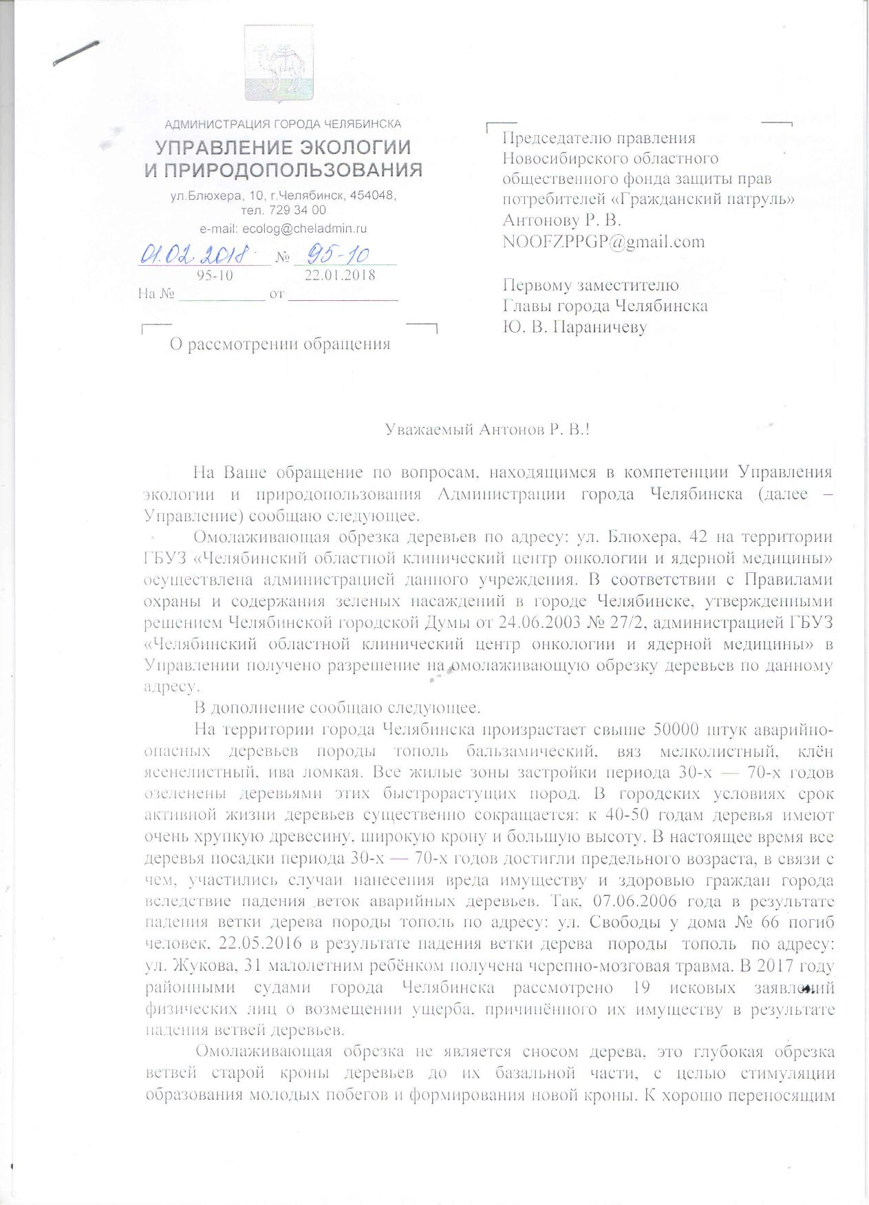 Номер жалобы:28893 Тип жалобы:Прочее Название объекта:Администрация г.Челябинска, Роспотребнадзор по Чел. Обл, Прокуратура Регион:Челябинская область Город:Челябинск Адрес:ул. Блюхера, 42а Описание жалобы:17.01.2017 по адресу Челябинск, ул.Блюхера 42а, во дворе Челябинской областной детской клинической больницы было выявлено повреждение более 10 деревьев вследствие нарушения правил выполнения омолаживающей обрезки. Данные правила определяются "Инструкцией по созданию и содержанию зеленых насаждений в городе Челябинске", утвержденной постановлением Главы города Челябинска от 02.12.2004 2200-п "Об утверждении инструкции по созданию и содержанию зеленых насаждений в городе Челябинске" (далее Инструкция). К письму прилагаются снимки результатов омолаживающей обрезки.