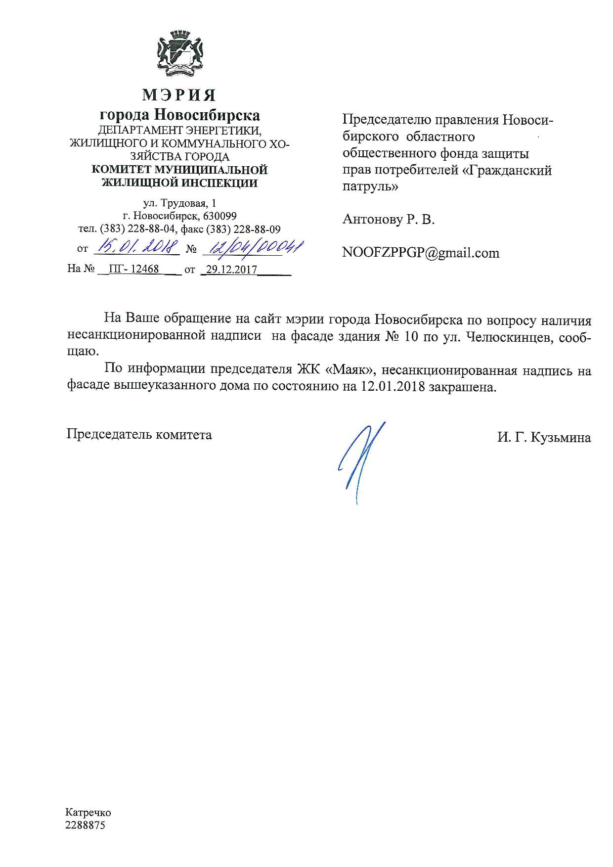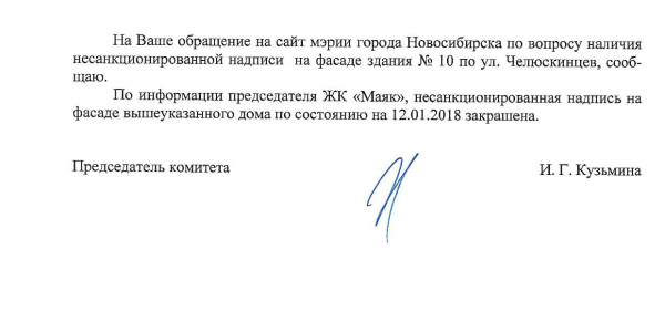 Номер жалобы:28429 Тип жалобы:Прочее Название объекта:Ук Регион:Новосибирская область Город:Новосибирск Адрес:ул. Челюскинцев, 10 Описание жалобы:Надписи Статус: