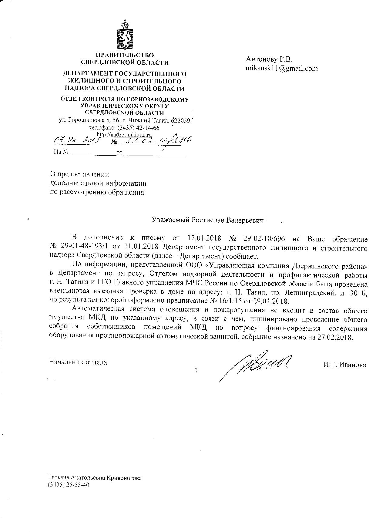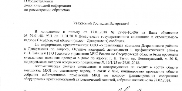 Номер жалобы:28446 Тип жалобы:Прочее Название объекта:Главное Управление МЧС По Свердловской Области Город:Нижний Тагил Адрес:Нижний Тагил, Ленинградский проспект, 30б Описание жалобы:Требуется пожарная инспекция многоквартирного жилого дома по адресу г. Нижний Тагил, Ленинградский проспект, дом 30Б. Дом оснащён автоматической системой оповещения и пожаротушения, управляющая компания «Дзержинского района» отказывается заключать договор с подрядчиком на обслуживание данной системы. В свою очередь, жильцы подвергаются опасности, при отключённой системе. Так же, в доме имеются гидранты на каждом этаже, но при этом отсутствуют пожарные рукава. Многие жильцы, возвели несогласованные перегородки на обездоливай территории, преградив работу датчиков вышеупомянутой сигнализации. Система современного поколения способна своевременно оповестить пожарную службу, но так как она не введена в эксплуатацию, этого не произойдёт. Так же нет возможности застраховать жильё от пожара, страховые компании отказываются страховать, в случае с отключённой системой пожаротушение. Просим произвести тщательную инспекцию, и сделать предписание управляющей компании о срочном заключении договора с подрясником, который способен обслуживать данную систему оповещения и пожаротушение. Жалобы со стороны жильцов, и предыдущая проверка не дали результатов. Статус: