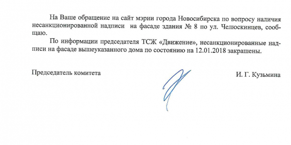 Номер жалобы:28428 Тип жалобы:Прочее Название объекта:Ук Регион:Новосибирская область Город:Новосибирск Адрес:ул. Челюскинцев, 8 Описание жалобы:Надписи Статус: