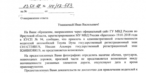 Номер жалобы:28480 Тип жалобы:Прочее Название объекта:ГИБДД Регион:Иркутская область Город:Братск Адрес:ул. Муханова, 32 Описание жалобы:Стоянка на тротуаре. 4.01.18, 17:00 Статус: