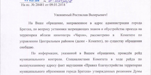 Номер жалобы:28481 Тип жалобы:Прочее Название объекта:Адм Регион:Иркутская область Город:Братск Адрес:ул. Крупской, 19 Описание жалобы:У кинотеатра "Чарли" на тротуарах организована стоянка авто посетителей. Создаётся опасность для других посетителей, в том числе детей. Для заезда на эту парковку порядка 70-100 метров авто едут по тротуарам. ГИБДД бездействует Статус: