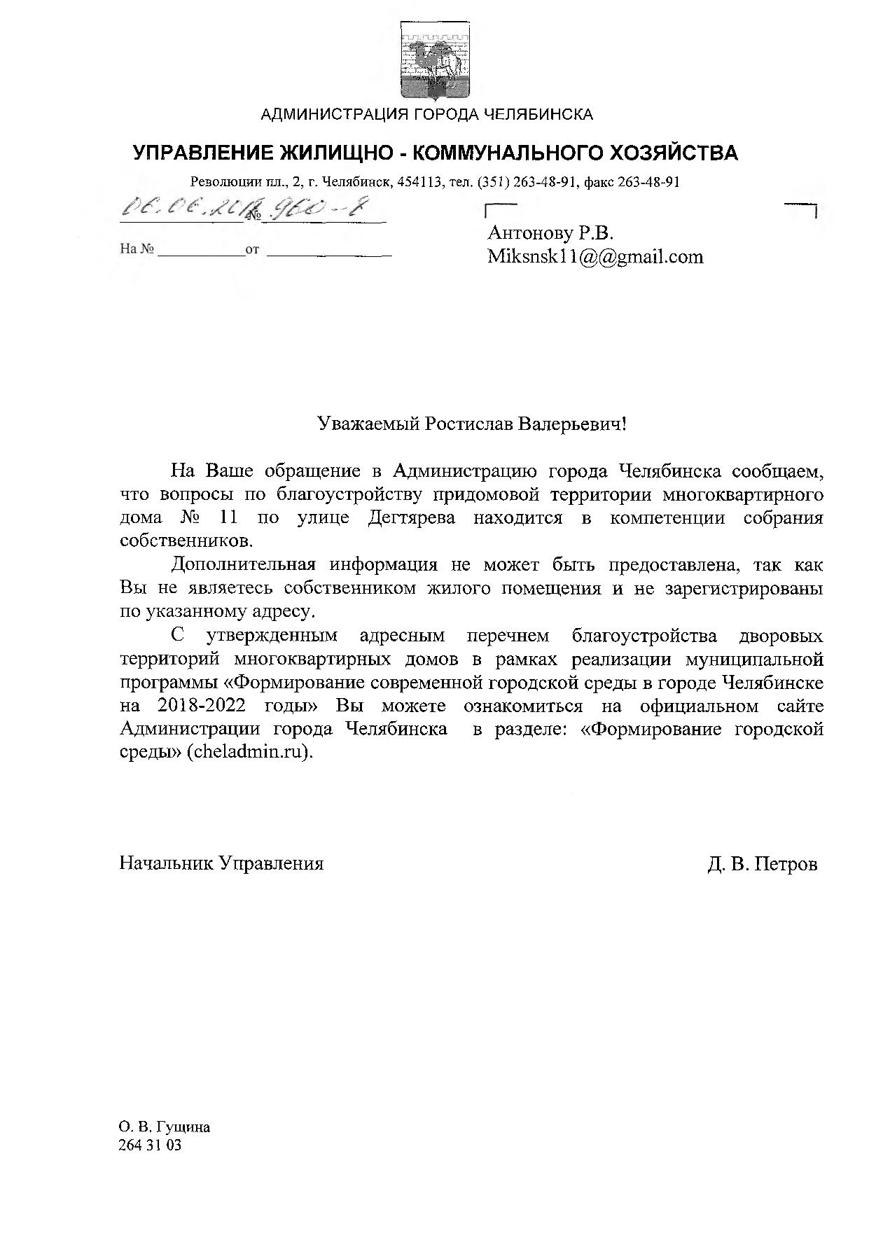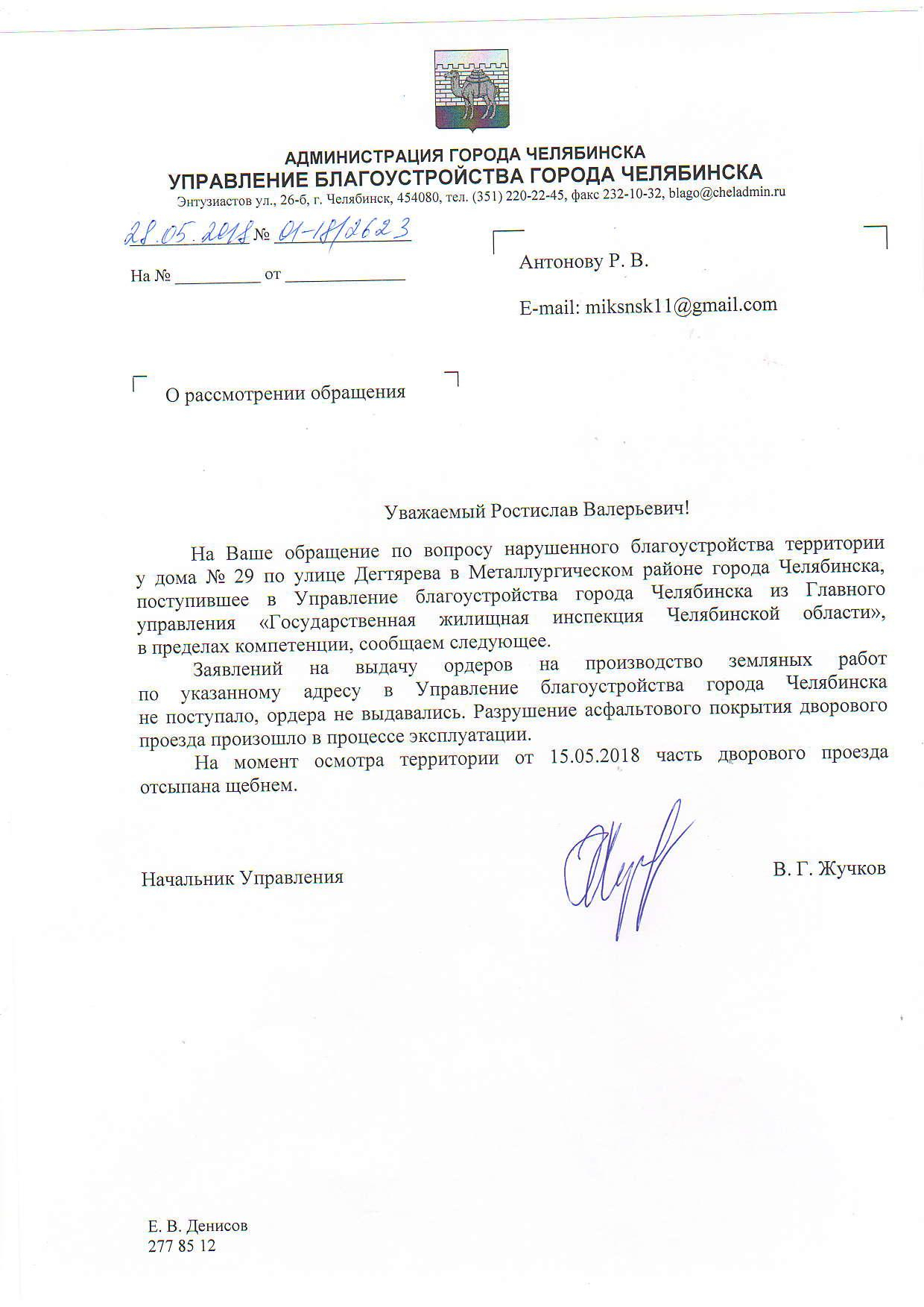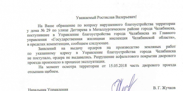 Номер жалобы:33290 Тип жалобы:Ямы во дворе Название объекта:Администрация Металлургического Района Регион:Челябинская область Город:Челябинск Адрес:ул. Дегтярева, 29 Описание жалобы:Разрушен асфальт на внутридворовом проезде,там постоянно вода и она не уходит неделями,под водой глубокие ямы. Жители домов жалуются на то,что там проваливаются и падают в лужи. Требуется укладка нового асфальтового покрытия,и обязательно выше уровня газонов и бордюра. Статус:
