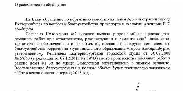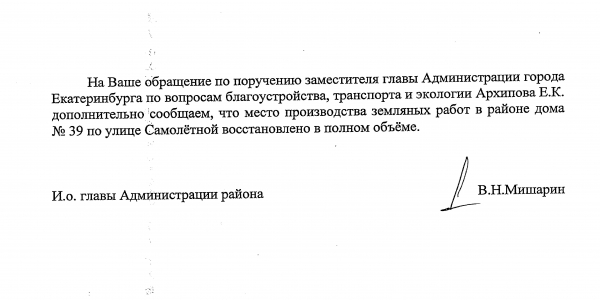 Номер жалобы:33099 Тип жалобы:Ямы во дворе Название объекта:Администрация Города Регион:Свердловская область Город:Екатеринбург Адрес:Самолетная ул., 39 Описание жалобы:Ремонт пешеходной зоны, озеленение Статус: