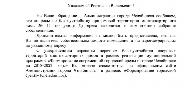 Номер жалобы:33271 Тип жалобы:Ямы во дворе Название объекта:Администрация, Управление ЖКХ Регион:Челябинская область Город:Челябинск Адрес:ул. Приборостроителей, 12 Описание жалобы:Во дворе домов Приборостроителей 12 и Дегтярева 9 через двор проходит оживленная тропинка, через нее проходит сотни людей в сутки,там открытый грунт и вечная грязь. Требуется ее заасфальтировать Статус:
