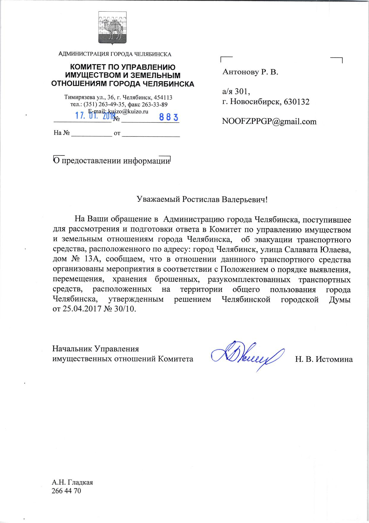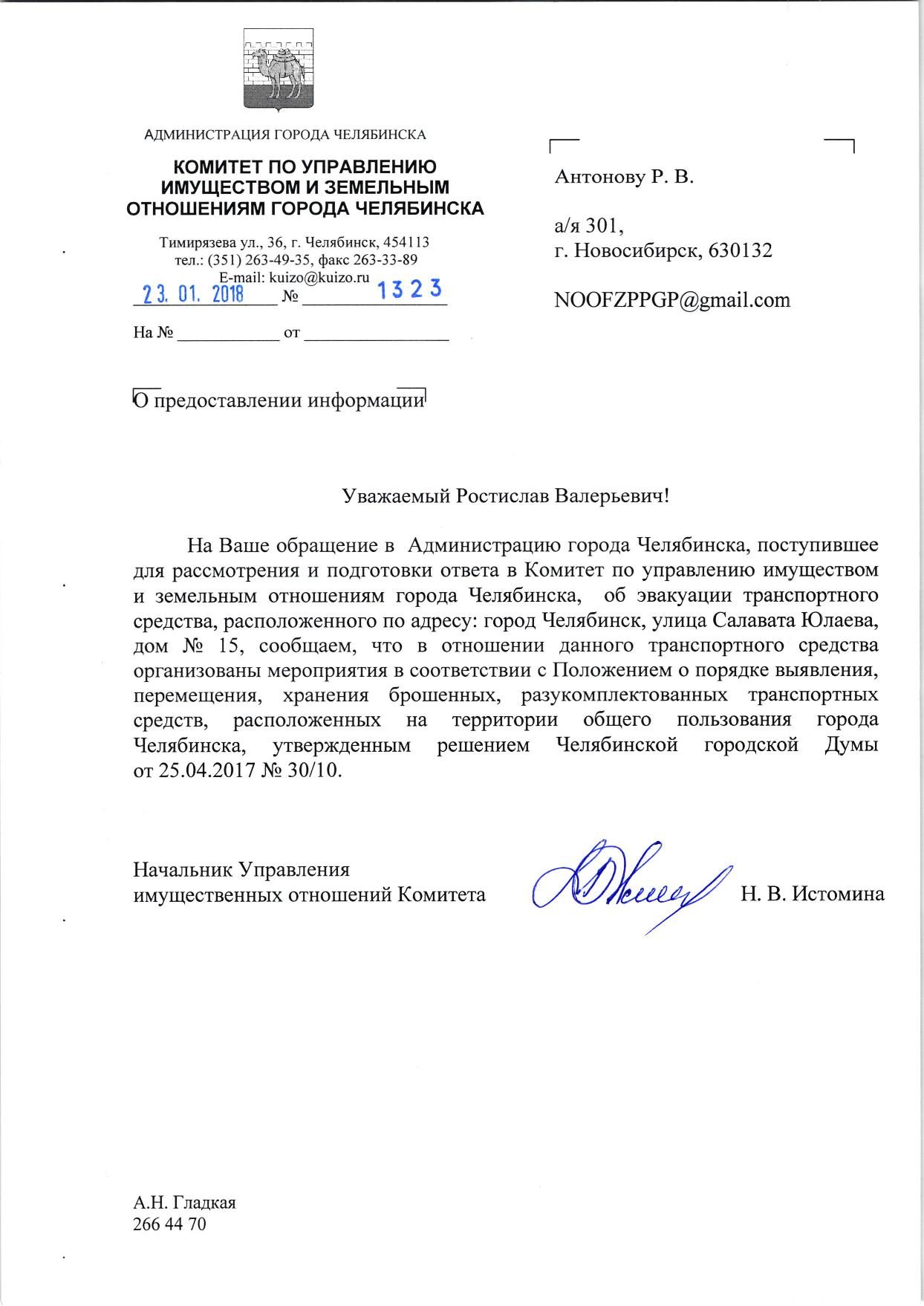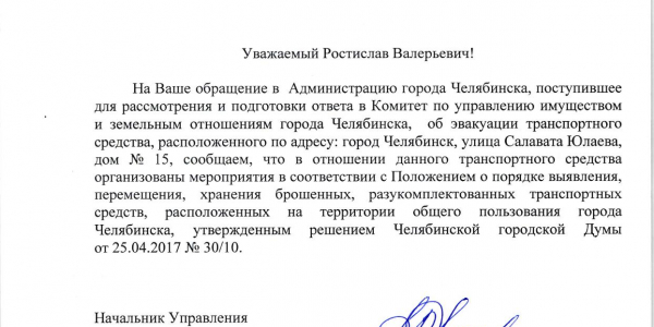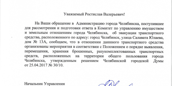 Номер жалобы:28025 Тип жалобы:Прочее Название объекта:Администрация Калининского Района Город:Челябинск Адрес:Челябинск, улица Салавата Юлаева, 13А Описание жалобы:Рядом с детской площадкой стоит брошенный автомобиль. Он сильно разрушен, припаркован на газоне. Прошу убрать опасное транспортное средство! Статус: