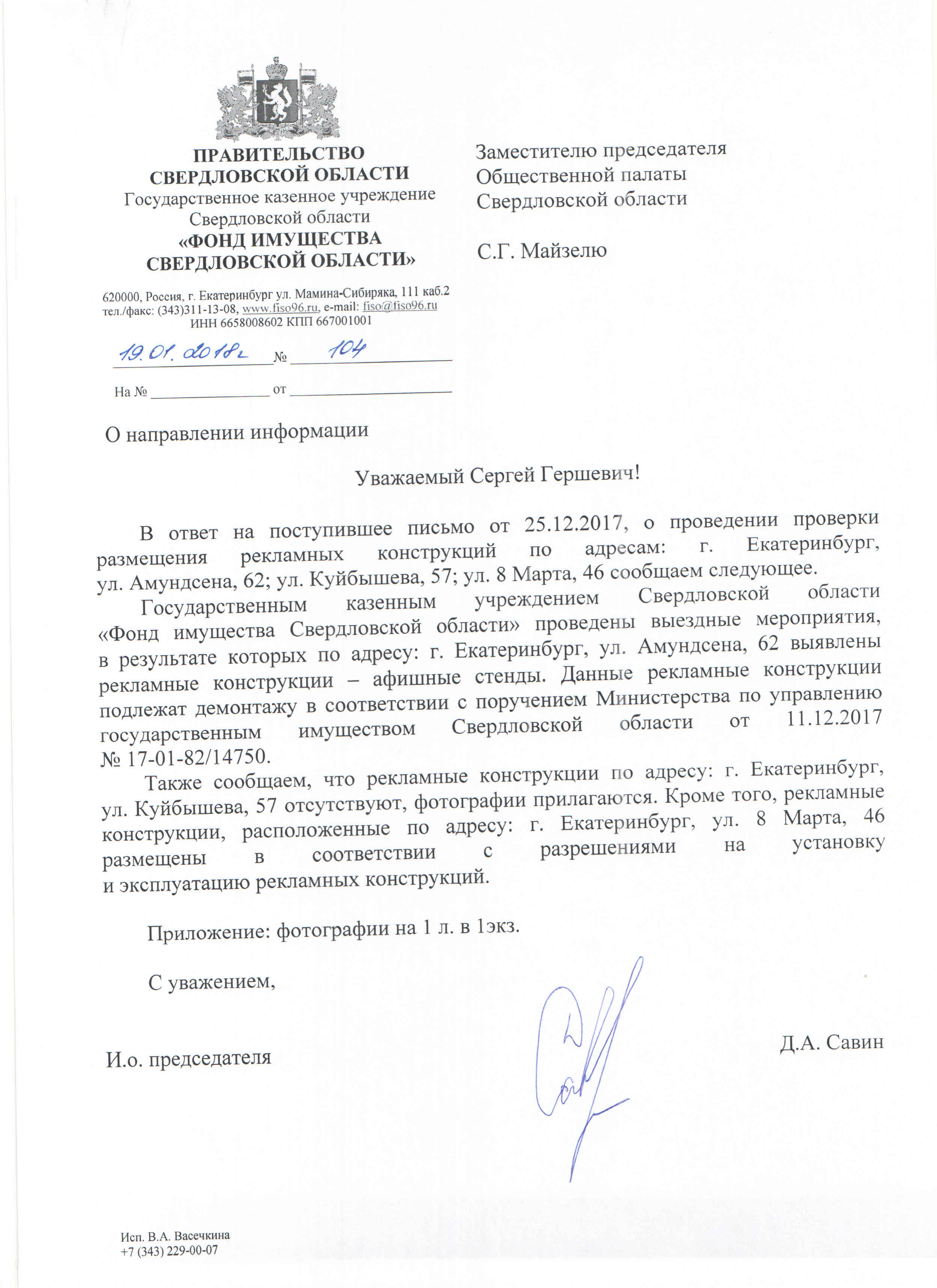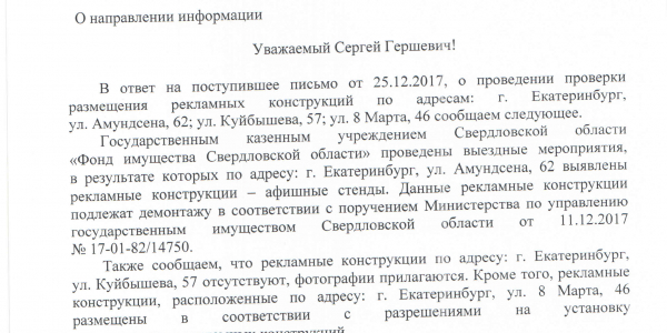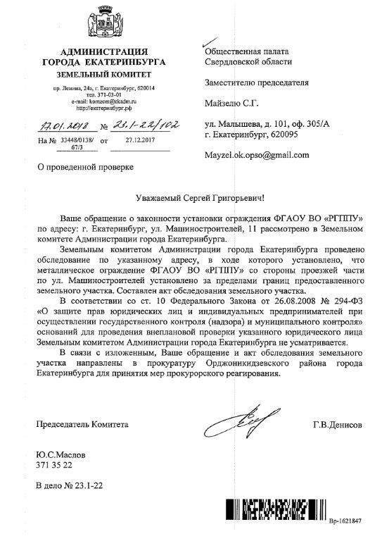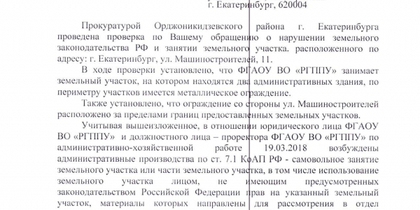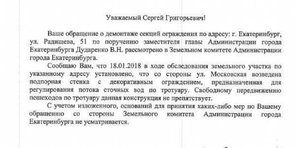 Номер жалобы:28125 Тип жалобы:Прочее Название объекта:Администрация Екатеринбурга Регион:Свердловская область Город:Екатеринбург Адрес:улица Радищева, 51 Описание жалобы:На землях общего пользования была начата установка капитального ограждения, сужающего ширину тротуара вдоль улицы Московской. В ответе земельного комитета администрации Екатеринбурга №23.1-22/3833 от 21.12.2017 на жалобу 27815 сообщается, что в адрес МОУ СДЮШОР №17, организовавшего работы, направлено предостережение о недопущении нарушения земельного законодательства. Прошу сообщить сроки демонтажа установленных на тротуаре секций забора. Статус: