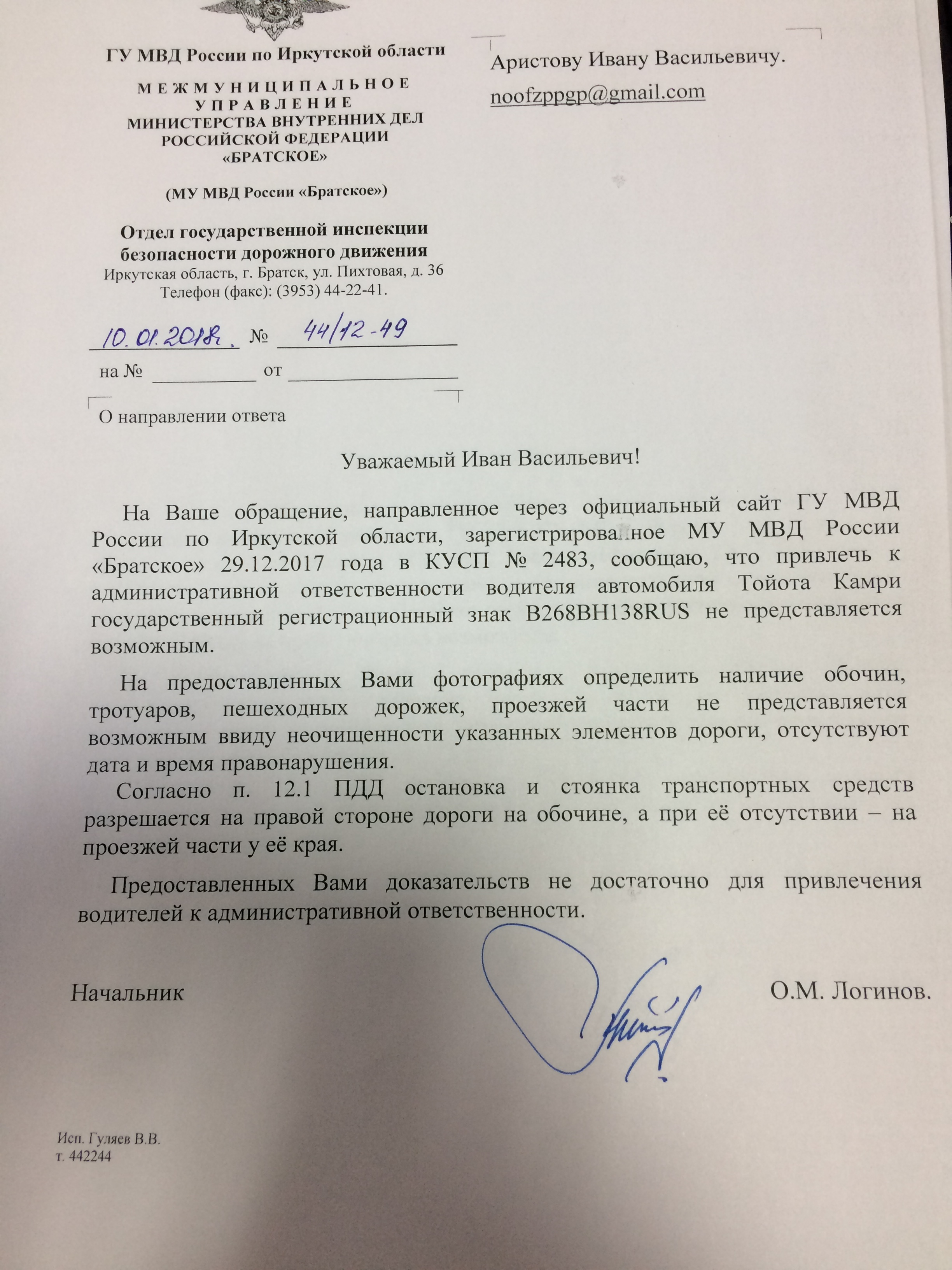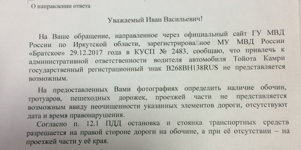 Номер жалобы:28114 Тип жалобы:Прочее Название объекта:ГИБДД Регион:Иркутская область Город:Братск Адрес:ул. Муханова, 32 Описание жалобы:Парковка на тротуаре. 24.12.2017, 13:30 Статус: