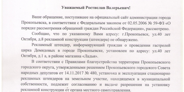 Номер жалобы:28106 Тип жалобы:Прочее Название объекта:- Регион:Кемеровская область Город:Прокопьевск Адрес:ул. 40 лет Октября, 8 Описание жалобы:Рекламный баннер в неположенном месте. Прикреплен к столбу проводкой. Местоположение рядом с остановкой Статус:
