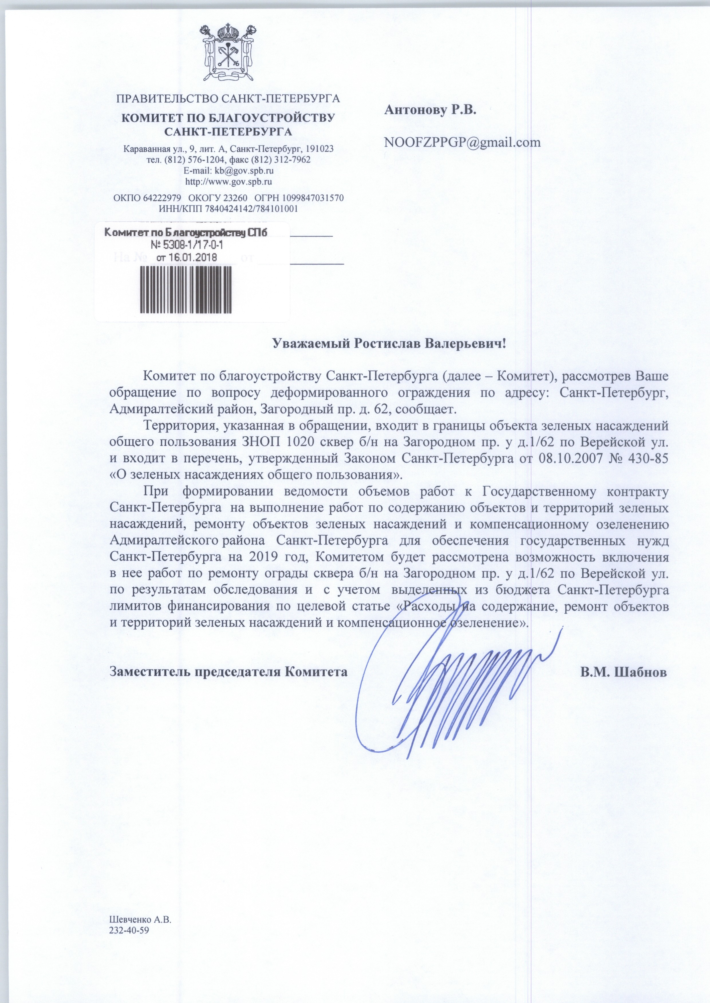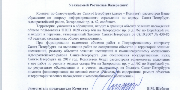 Номер жалобы:27945 Тип жалобы:Прочее Название объекта:Районная Администрация Город:Санкт-Петербург Адрес:Санкт-Петербург, Загородный проспект, 62 Описание жалобы:Забор погнут Статус: