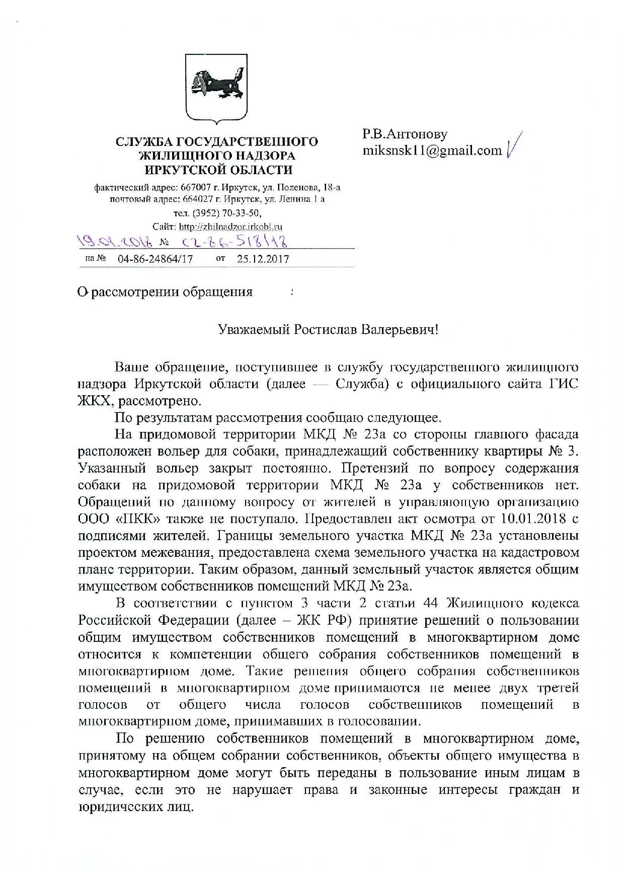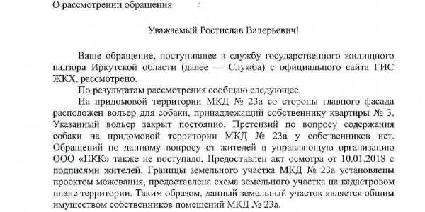 Прошу разобраться в следующей ситуации. По адресу Гидростроителей, 23А жильцами дома во дворе установлен "вольер" для взрослой собаки породы кавказская овчарка. Время от времени собака выбегает из вольера и бросается на прохожих, в том числе детей, что представляет реальную опасность, так как хозяева содержат ее без намордника. На каких основаниях жильцы обустроили вольер на придомовой территории? Почему собака содержится в условиях, представляющих опасность для прочих жителей двора? Налицо несоблюдение владельцами домашнего животного правил его содержания, поскольку содержится оно в месте общего пользования. Прошу принять меры в отношении владельцев животного и незаконной пристройки. Статус: