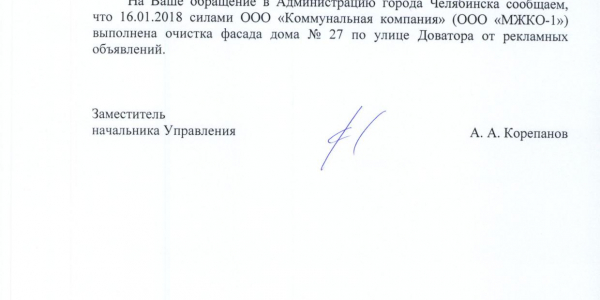 Номер жалобы:27984 Тип жалобы:Прочее Название объекта:Администрация Регион:Челябинская область Город:Челябинск Адрес:ул. Доватора, 27 Описание жалобы:Незаконная реклама Статус: