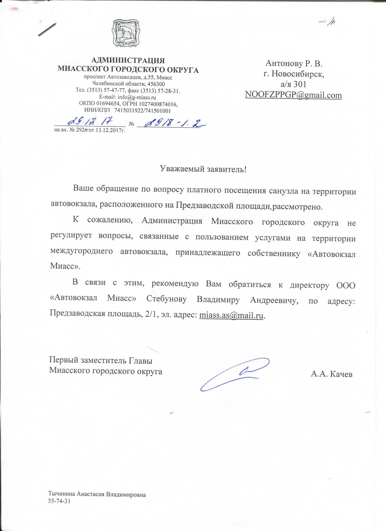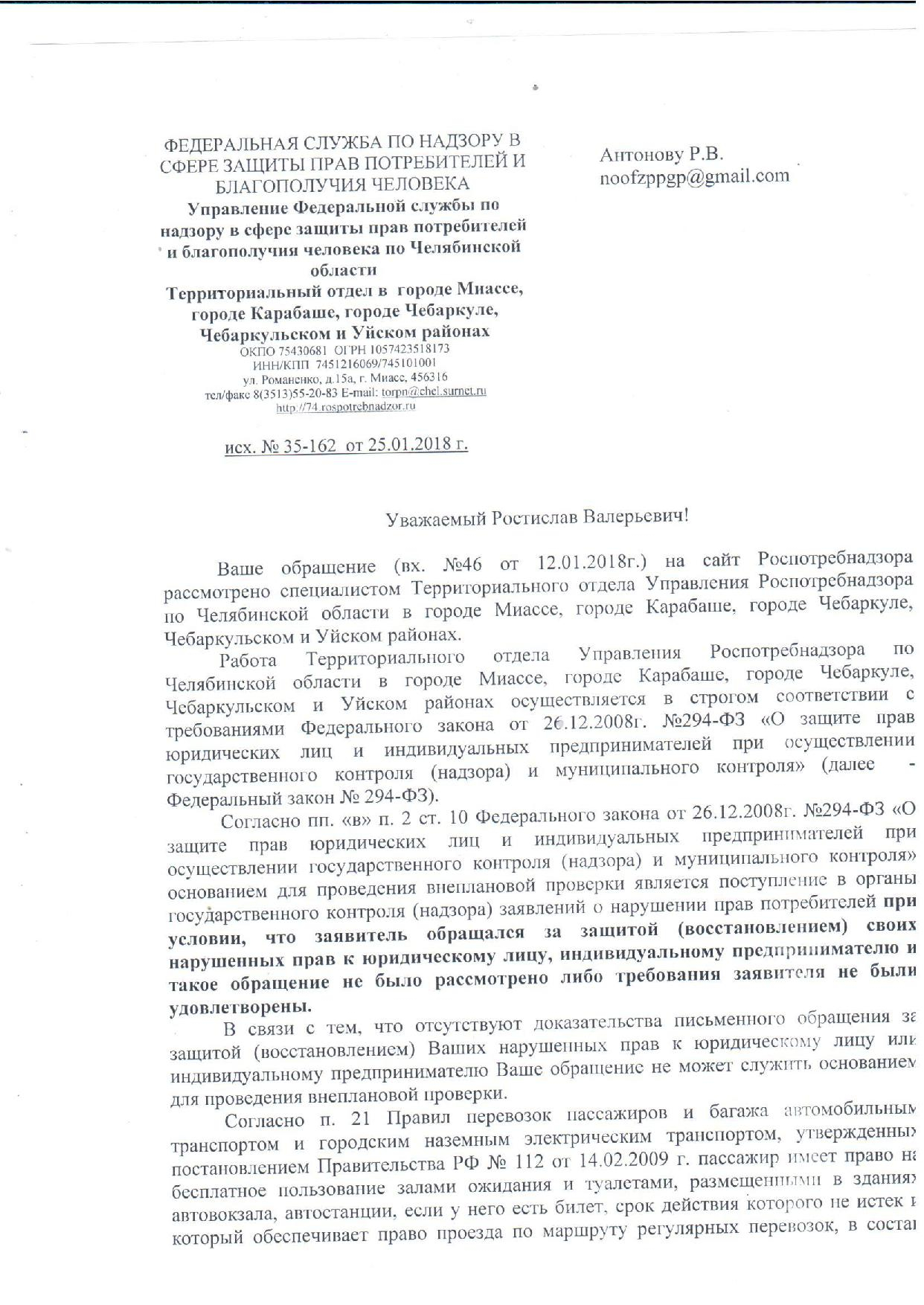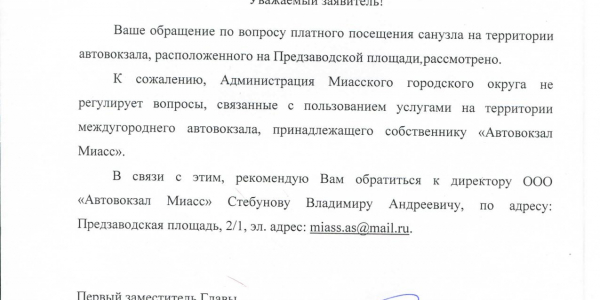 Номер жалобы:27805 Тип жалобы:Прочее Название объекта:Прокуратура г. Миасса Регион:Челябинская область Город:Миасс Адрес:ул. Предзаводская, 1 Описание жалобы:Разъясните законность платного туалета на автовокзале. Туалет является единственным на автостанции. Статус: