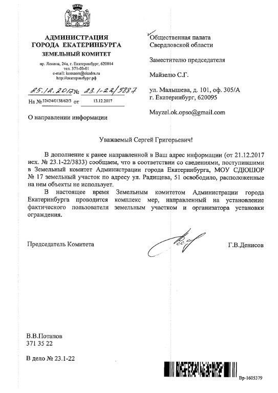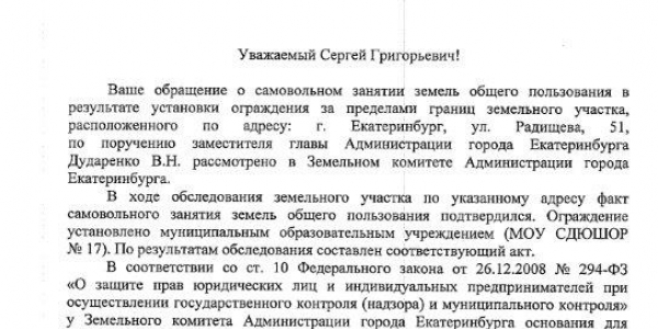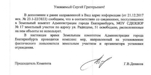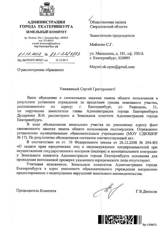 Номер жалобы:27815 Тип жалобы:Прочее Название объекта:Администрация Екатеринбурга Регион:Свердловская область Город:Екатеринбург Адрес:улица Радищева, 51 Описание жалобы:На землях общего пользования устанавливается капитальное ограждение, сужающее ширину тротуара вдоль улицы Московской (на фотографии в центре). Ответ администрации Верх-Исетского района Екатеринбурга №62/04-14/3587 от 07.12.2017 на жалобу 27379 даётся о временном ограждении места производства земляных работ (на фотографии слева). Нужно остановить работы по возведению капитального забора и выполнить работы по демонтажу установленных на тротуаре секций забора. Статус: