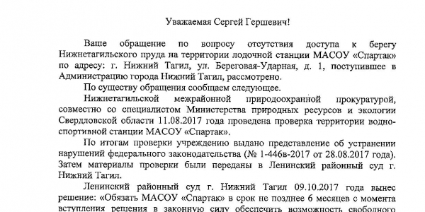 Номер жалобы:27793 Тип жалобы:Прочее Название объекта:Администрация Нижнего Тагила Регион:Свердловская область Город:Нижний Тагил Адрес:Береговая-Ударная улица, 1 Описание жалобы:Отсутствует доступ к берегу Нижнетагильского пруда на территории яхт-клуба «Спартак». Статус: