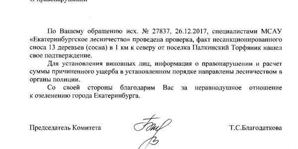 Номер жалобы:27837 Тип жалобы:Прочее Название объекта:Департамент лесного хозяйства Свердловской области Регион:Свердловская область Город:Екатеринбург Адрес:(56.870220, 60.356200) Описание жалобы:Незаконная вырубка леса в 1 км к северу от посёлка Палкинский Торфяник в месте с координатами 56.870220° N, 60.356200° E. Статус: