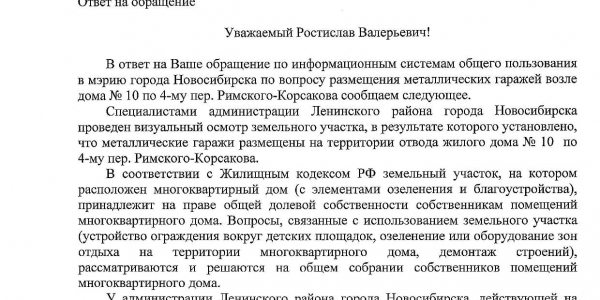 Номер жалобы:30896 Тип жалобы:Иные проблемы ЖКХ Название объекта:Управляющая Компания Город:Новосибирск Адрес:Новосибирск, 4-й Римского-Корсакова переулок, 10 Описание жалобы:Гаражи Статус: