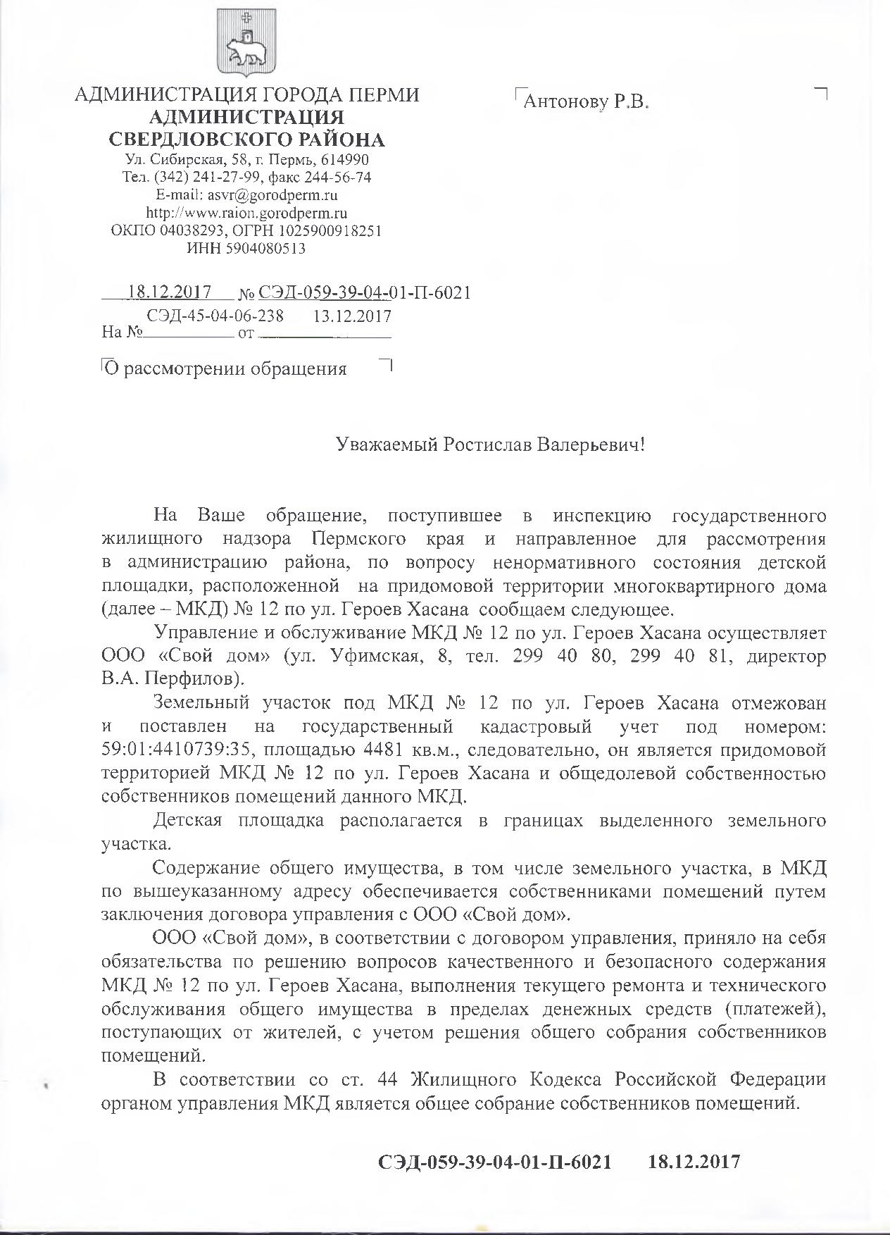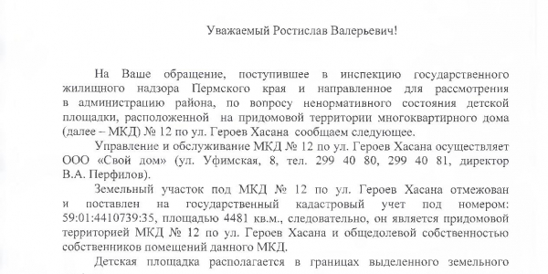 Номер жалобы:27585 Тип жалобы:Прочее Название объекта:Площадка Высокой Культуры Регион:Пермский край Город:Пермь Адрес:ул. Героев Хасана, 12 Описание жалобы:Очередная детская площадка в плохом состоянии Статус: