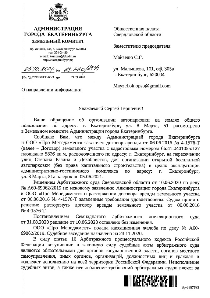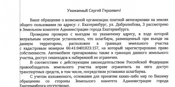 Номер жалобы:68766 Тип жалобы:Прочее Название объекта: Регион:Свердловская область Город:Екатеринбург Адрес:улица 8 Марта, 51 Описание жалобы:Около БЦ Саммит на улице Декабристов находится большая парковка. Доступ к парковке ограничен шлагбаумом, которым управляет администрация БЦ. Часть парковки находится на муниципальной земле, а часть для организации бесплатной парковки. Прошу проверить законность действий администрации БЦ Статус: