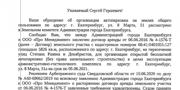 Номер жалобы:68773 Тип жалобы:Прочее Название объекта: Регион:Свердловская область Город:Екатеринбург Адрес:улица 8 Марта, 49 Описание жалобы:Около БЦ Арена вдоль улицы 8 марта находится парковка, доступ к которой шлагбаумом. Часть парковки находится на муниципальной земле. Прошу проверить законность перекрытия. В случае нарушения демонтировать ограждения. Статус: