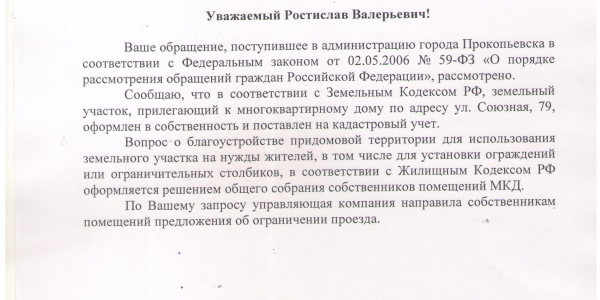 Номер жалобы:32514 Тип жалобы:Ямы во дворе Название объекта:1 Регион:Кемеровская область Город:Прокопьевск Адрес:ул. Союзная, 79 Описание жалобы:Ранее там была трава, потом тропа, теперь сделали проезд разводы грязь по остановке и двору. Переезжая через пешеходную дорожку, разрушая бордюры и покрытие. Просьба установить столбики и ограничить проезд. Статус: