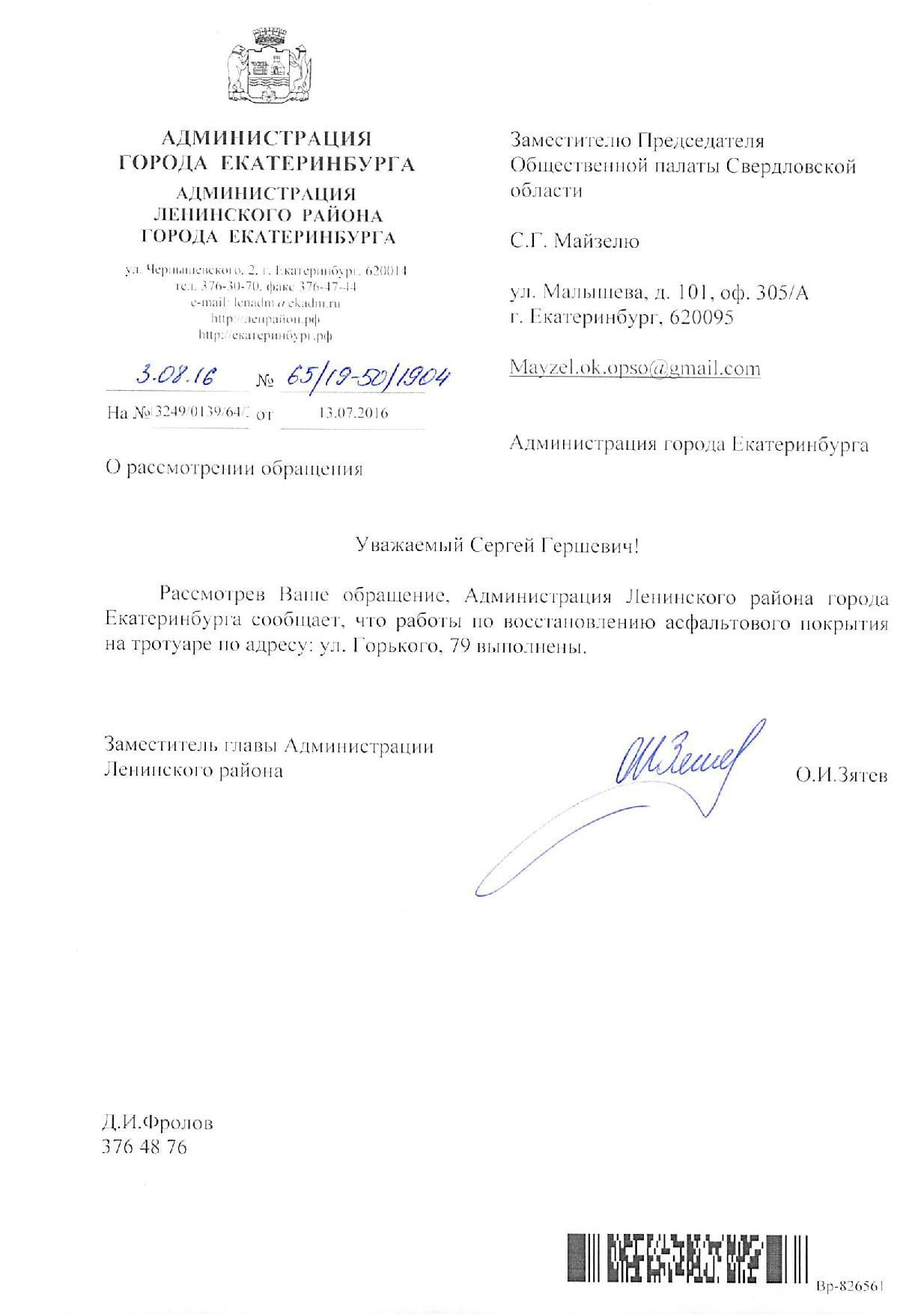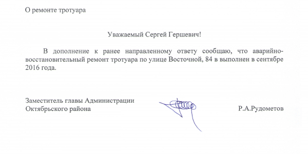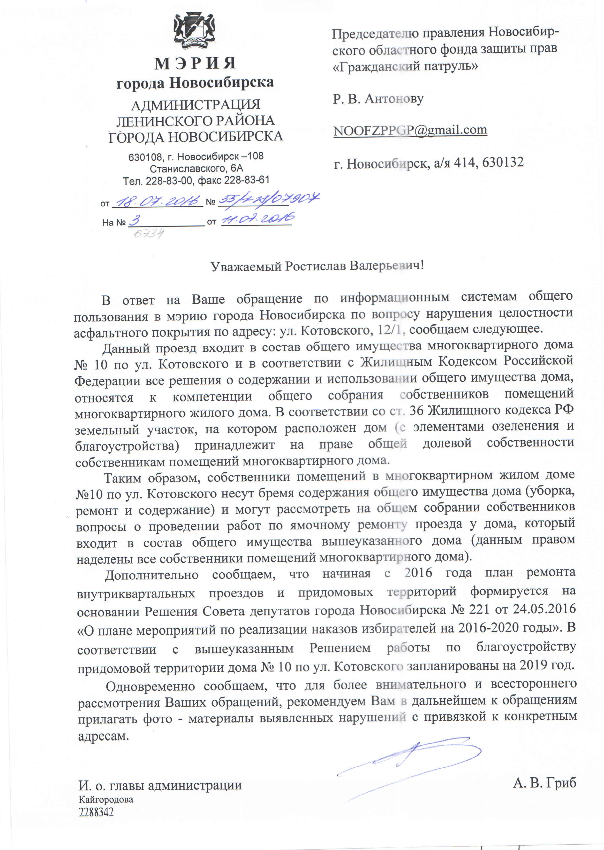 Номер жалобы:6734 Тип жалобы:Ямы на тротуарах Название объекта:Мэрия Регион:Новосибирская область Город:Новосибирск Адрес:ул. Котовского, 12/1 Описание жалобы:Разбита межквартальная дорога Статус: