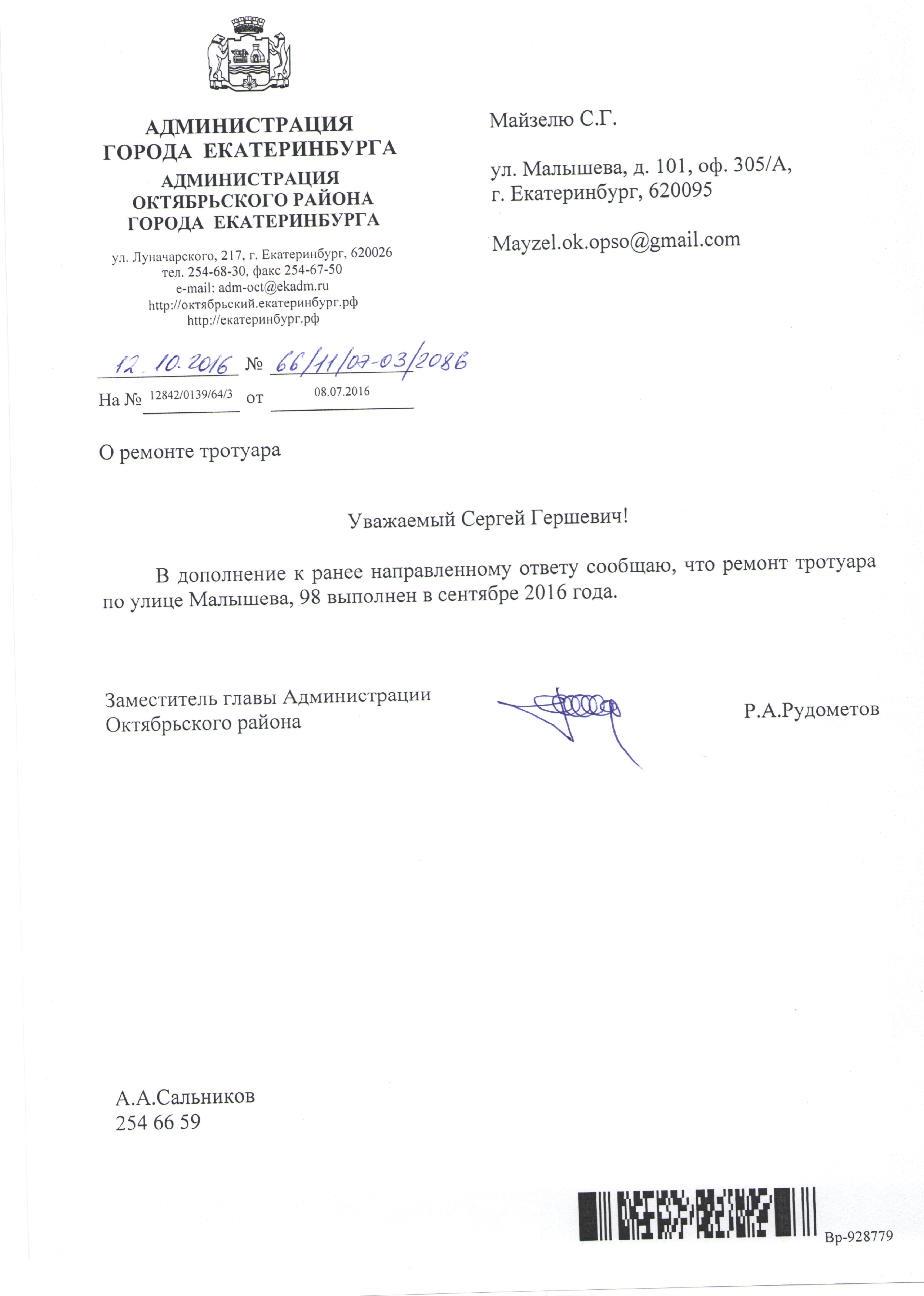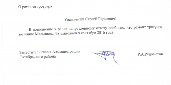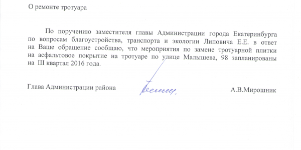 Номер жалобы:6658 Тип жалобы:Ямы на тротуарах Название объекта: Регион:Свердловская область Город:Екатеринбург Адрес:Малышева, 98 Описание жалобы:Выщерблен бехатон, необходима замена Статус: