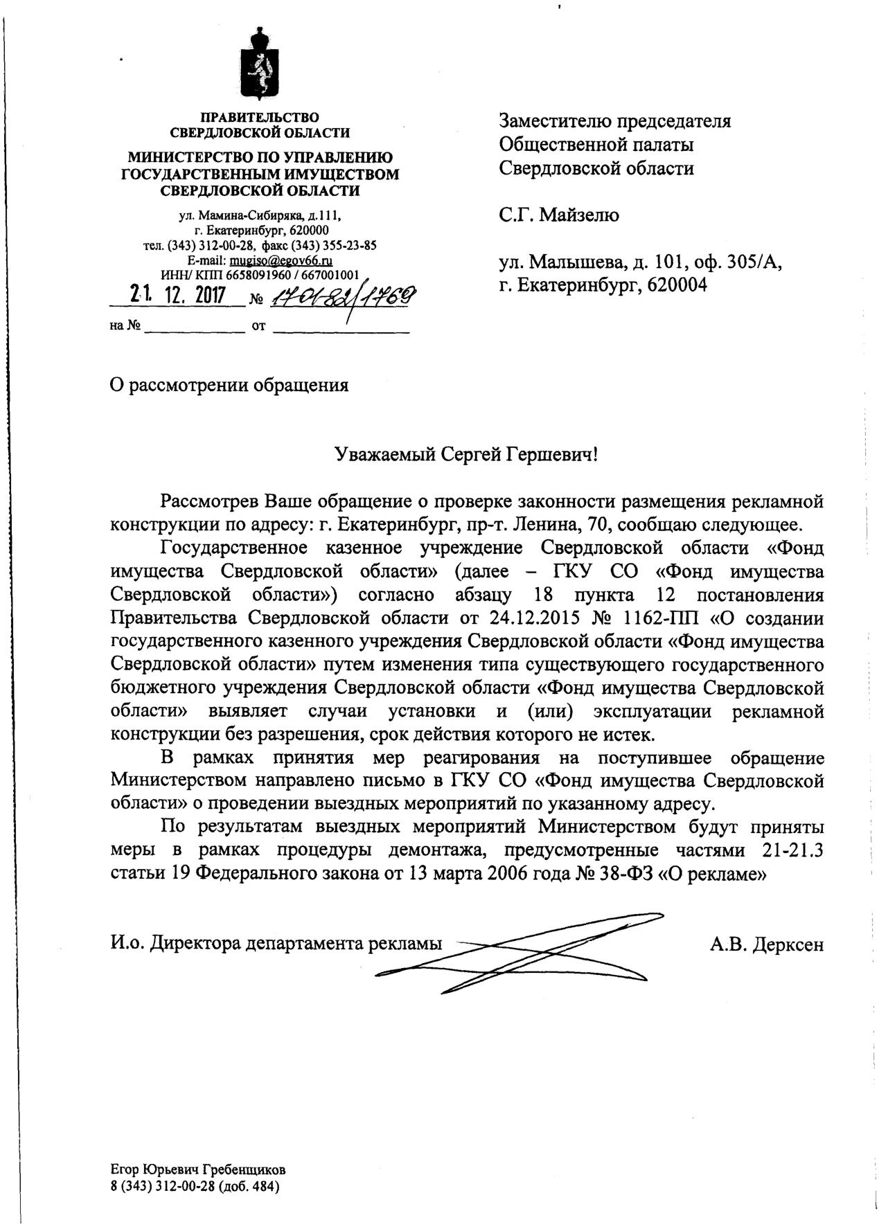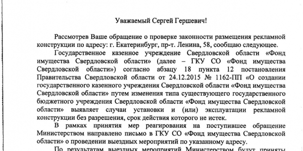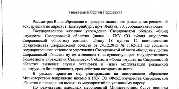 Номер жалобы:27392 Тип жалобы:Прочее Название объекта:Министерство Госимущества Свердловской Области Регион:Свердловская область Город:Екатеринбург Адрес:просп. Ленина, 70 Описание жалобы:Рекламные плакаты на фасаде дома 70 по проспекту Ленина, обращённому к дому 68 по проспекту Ленина. Статус: