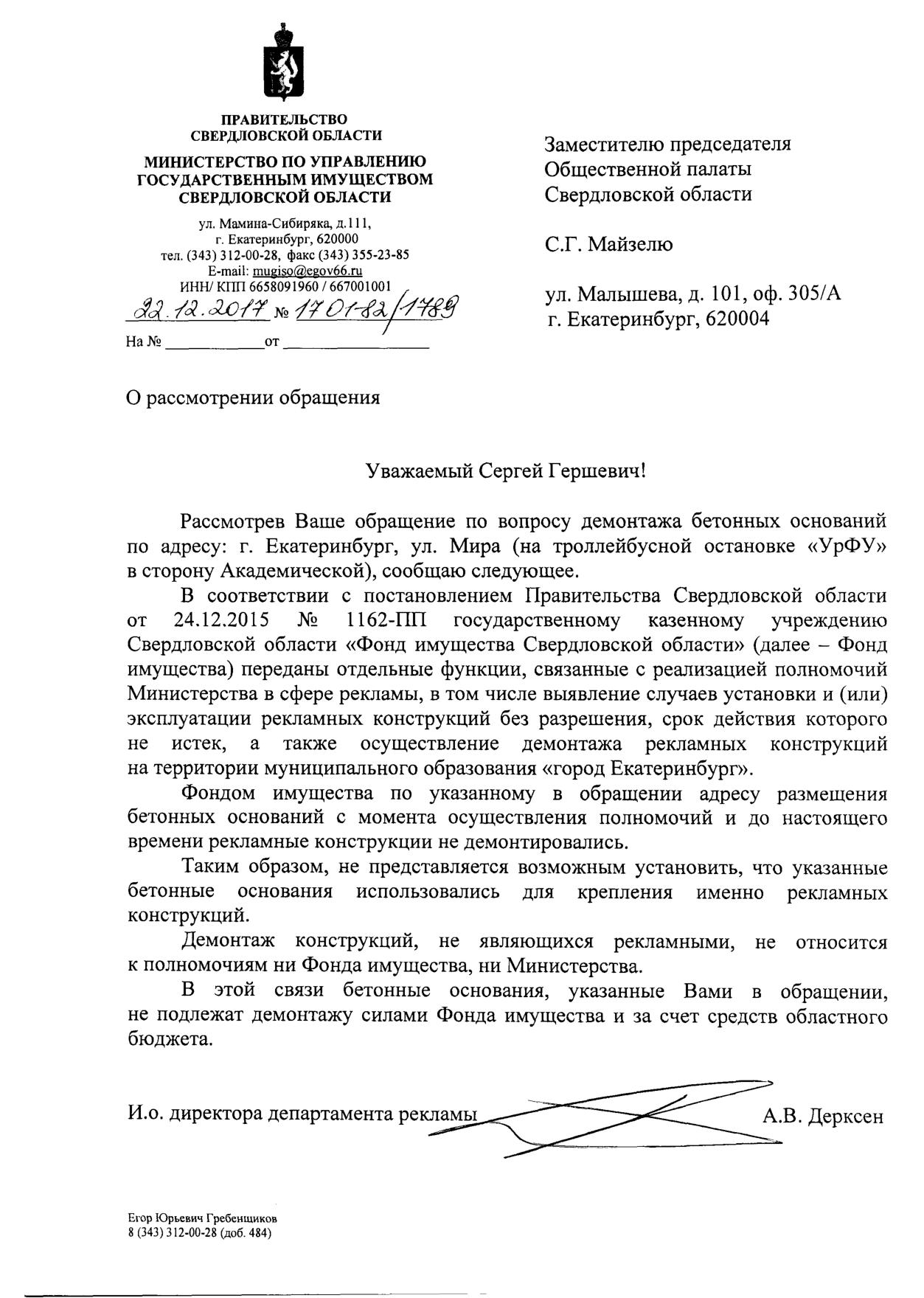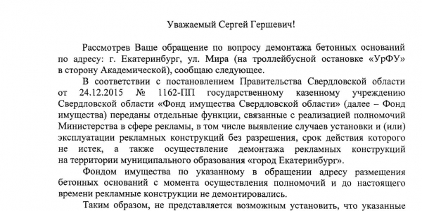 Номер жалобы:27391 Тип жалобы:Прочее Название объекта:Министерство Госимущества Свердловской Области Регион:Свердловская область Город:Екатеринбург Адрес:просп. Ленина, 58 Описание жалобы:Над проезжей частью проспекта Ленина с обеих сторон железнодорожного путепровода размещены рекламные щиты. Статус: