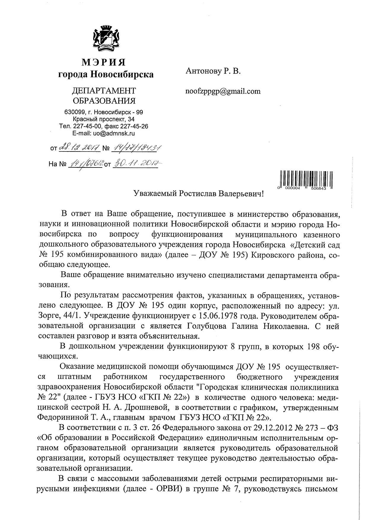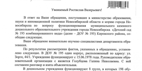 Номер жалобы:27400 Тип жалобы:Прочее Название объекта:Сад 195 Регион:Новосибирская область Город:Новосибирск Адрес:ул. Зорге, 44 Описание жалобы:В ясельной группе из 24 ребятишек пришло восемь. На следующий день группу закрыли из-за низкой посещаемости. Но ведь детки только начали адаптироваться и им, тем, кто ходит, пусть и восемь, снова, как первый раз, приходится походить адаптацию, бороться с собой, со своими страхами. Это не правильно. Во вторых родители работают, им нужно кормить семью, а не сидеть в бесконечных административных отпусках. И судя по тому, что группу 7 закрывали за последние недели уже два раза, такая политика в саду- норма. Получается, что группа так весь год будет, то туда то сюда, ведь дети в яслях постоянно будут болеть. Родители детей группы7 в Шоке от такой политики((( Статус: