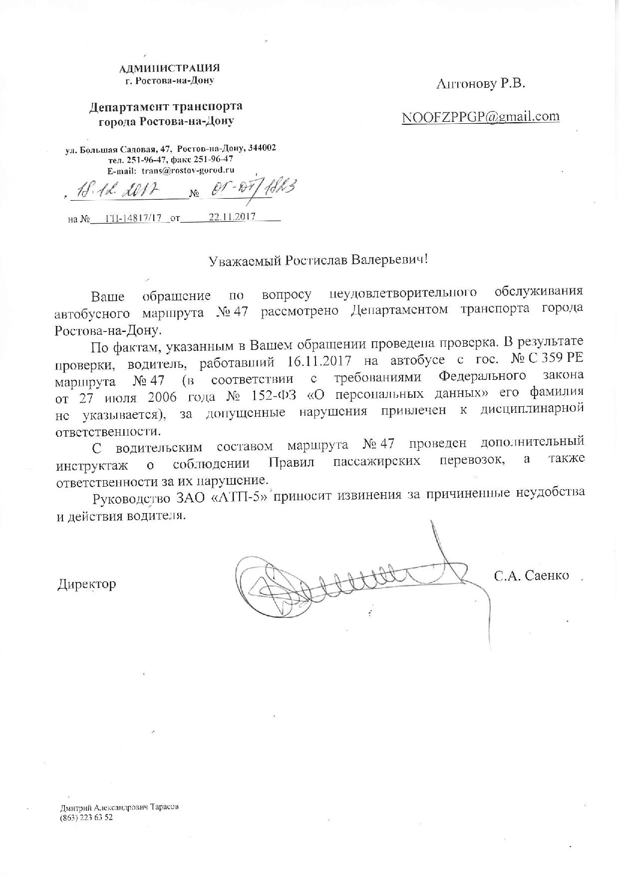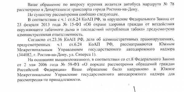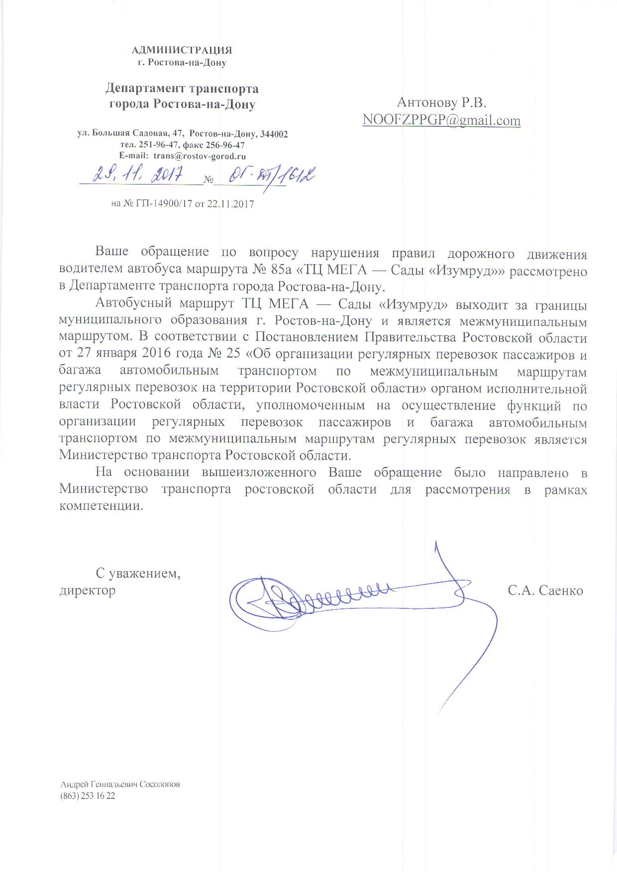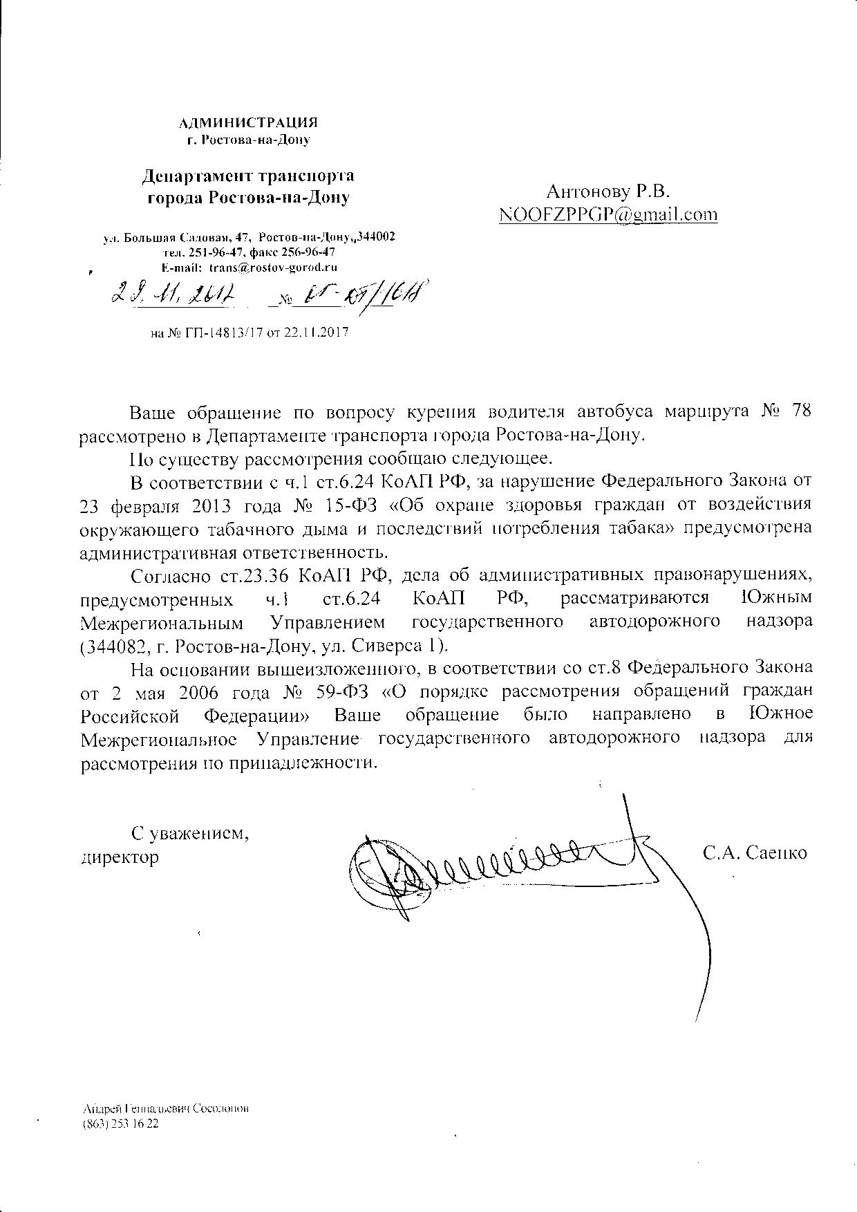 Номер жалобы:27195 Тип жалобы:Прочее Название объекта:Департамент транспорта г.Ростов-на-Дону Город:Ростов-на-Дону Адрес:Горизонт Описание жалобы:Дата и время нарушения 16.11.2017 15:40