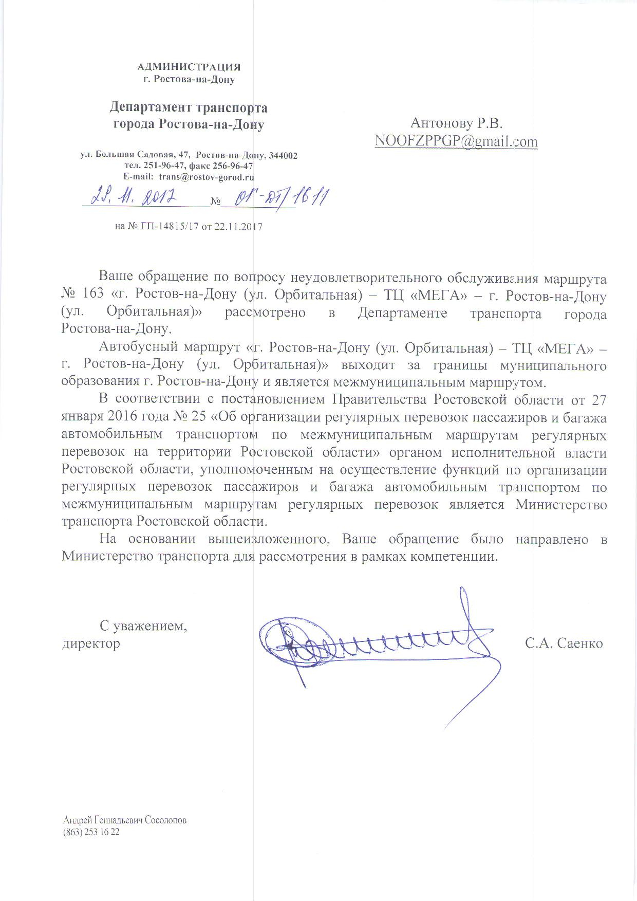 Номер жалобы:27189 Тип жалобы:Прочее Название объекта:Департамент транспорта г.Ростов-на-Дону Город:Ростов-на-Дону Адрес:Шолохово Описание жалобы:Дата и время нарушения 14.11.2017 21:00