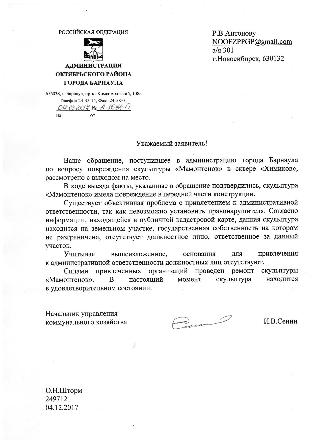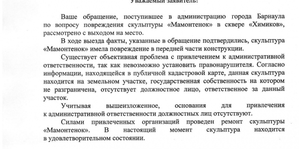Номер жалобы:27203 Тип жалобы:Прочее Название объекта:администрация города Регион:Алтайский край Город:Барнаул Адрес:ул. Смирнова, 83 Описание жалобы:сломанная скульптура "Мамонтенок" Статус: