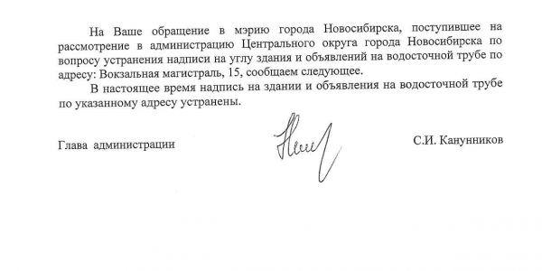 Номер жалобы:30743 Тип жалобы:Иные проблемы ЖКХ Название объекта:Управляющая Компания Регион:Новосибирская область Город:Новосибирск Адрес:ул. Вокзальная Магистраль,49 Описание жалобы:Вокзальная магистраль 19, надписи на фасаде дома Статус: