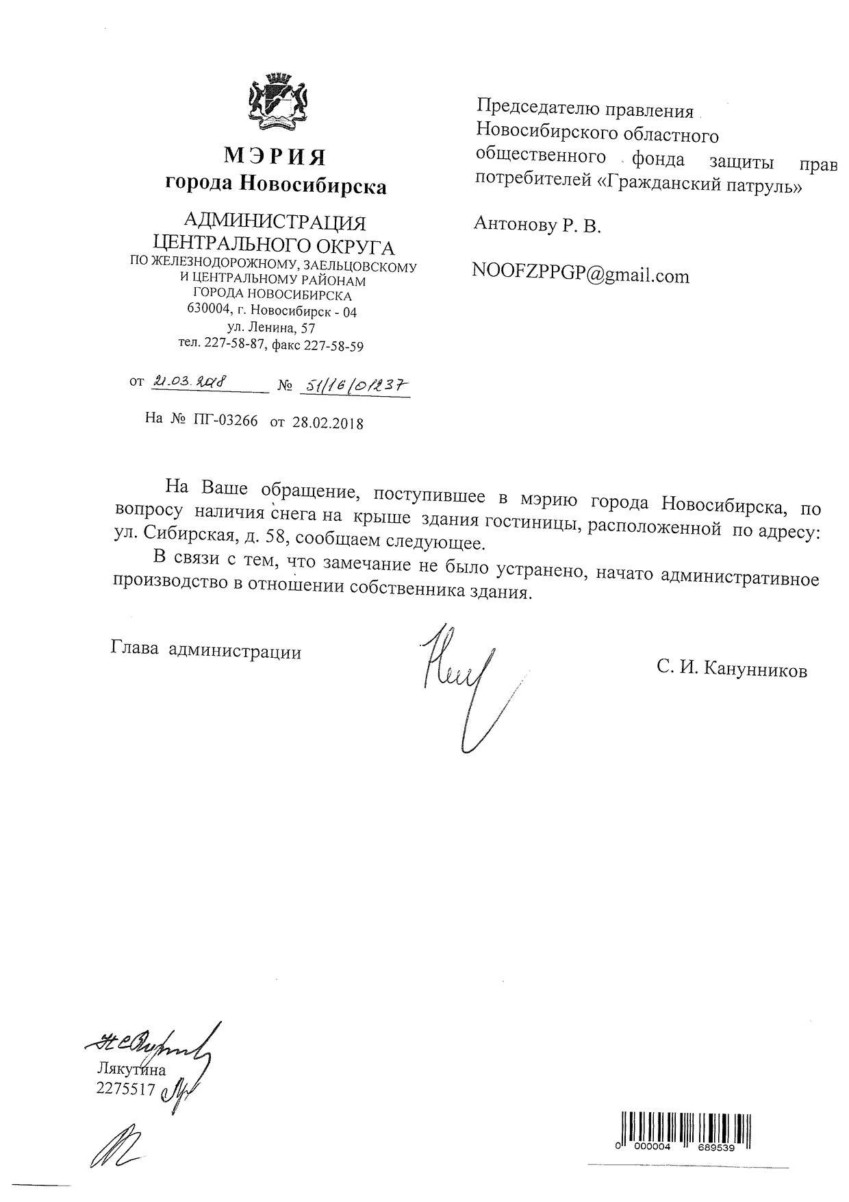 Номер жалобы:30721 Тип жалобы:Иные проблемы ЖКХ Название объекта:Управляющая Компания Регион:Новосибирская область Город:Новосибирск Адрес:ул. Сибирская, 54/1 Описание жалобы:Сибирская 54, снег на крыше дома Статус: