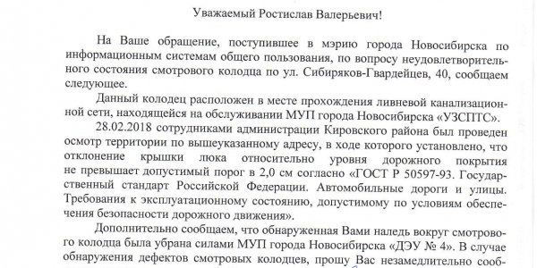 Номер жалобы:30553 Тип жалобы:Ямы во дворе Название объекта:Управляющая Компания Город:Новосибирск Адрес:Новосибирск, улица Сибиряков-Гвардейцев, 40 Описание жалобы:Комментарий Статус: