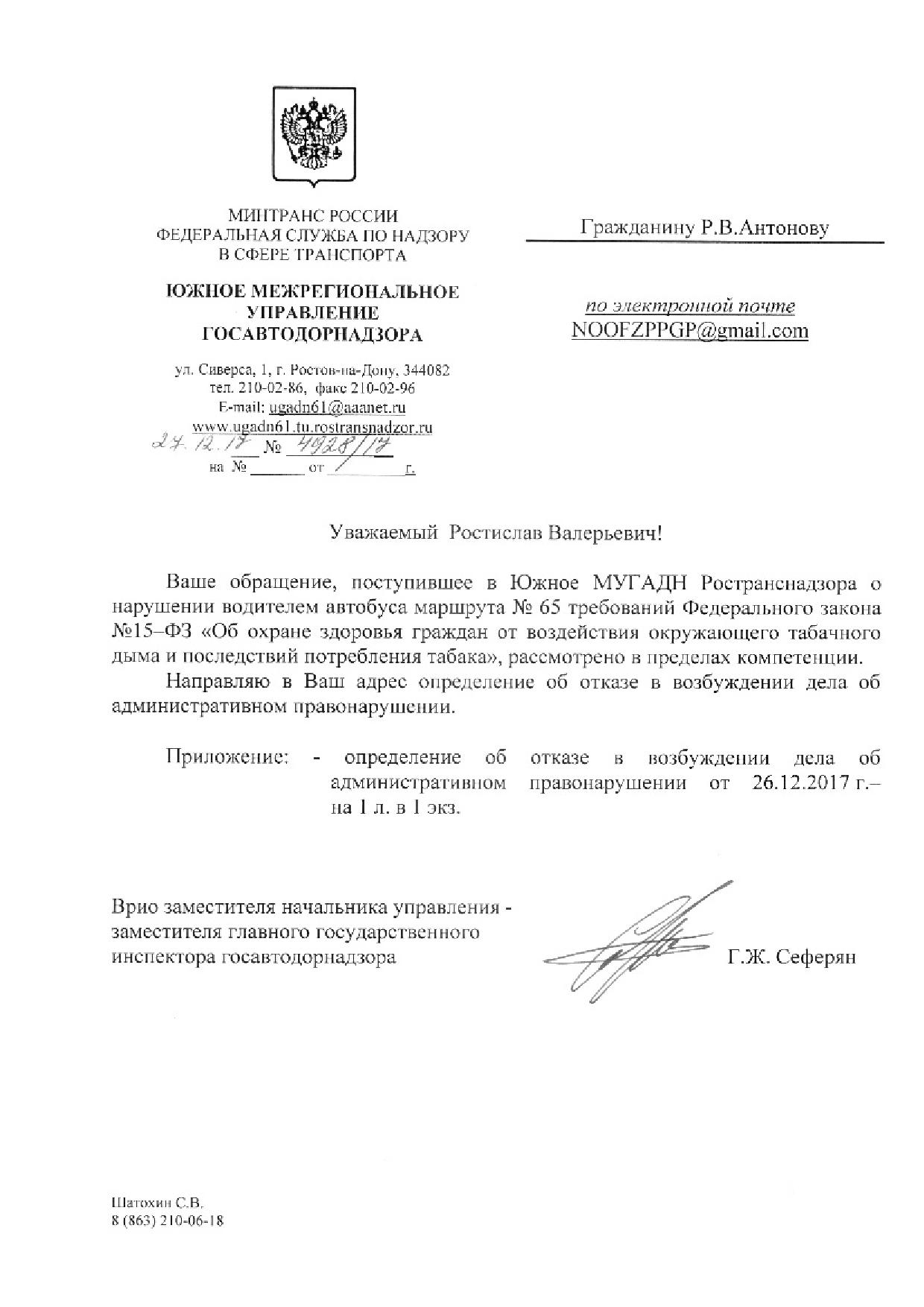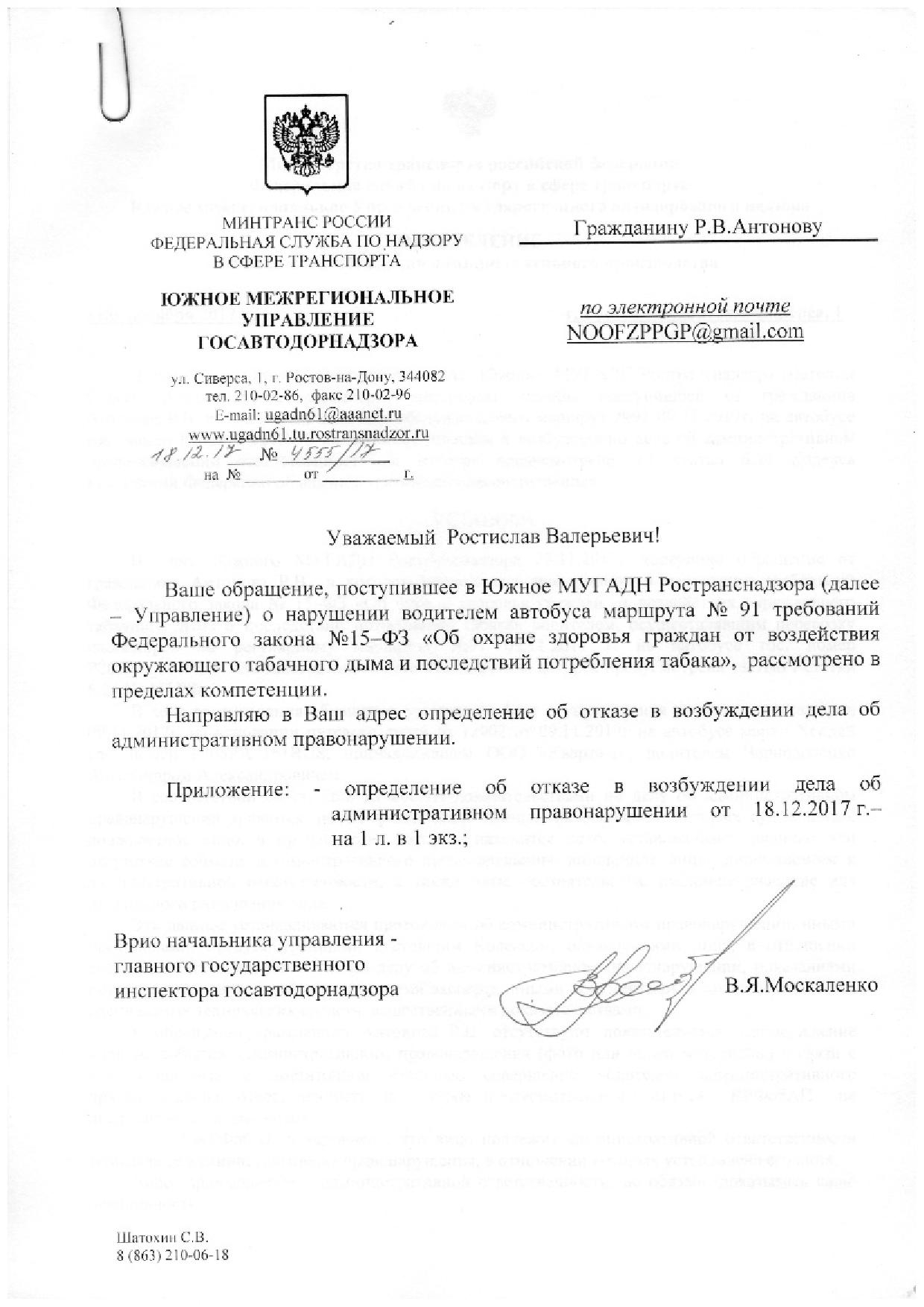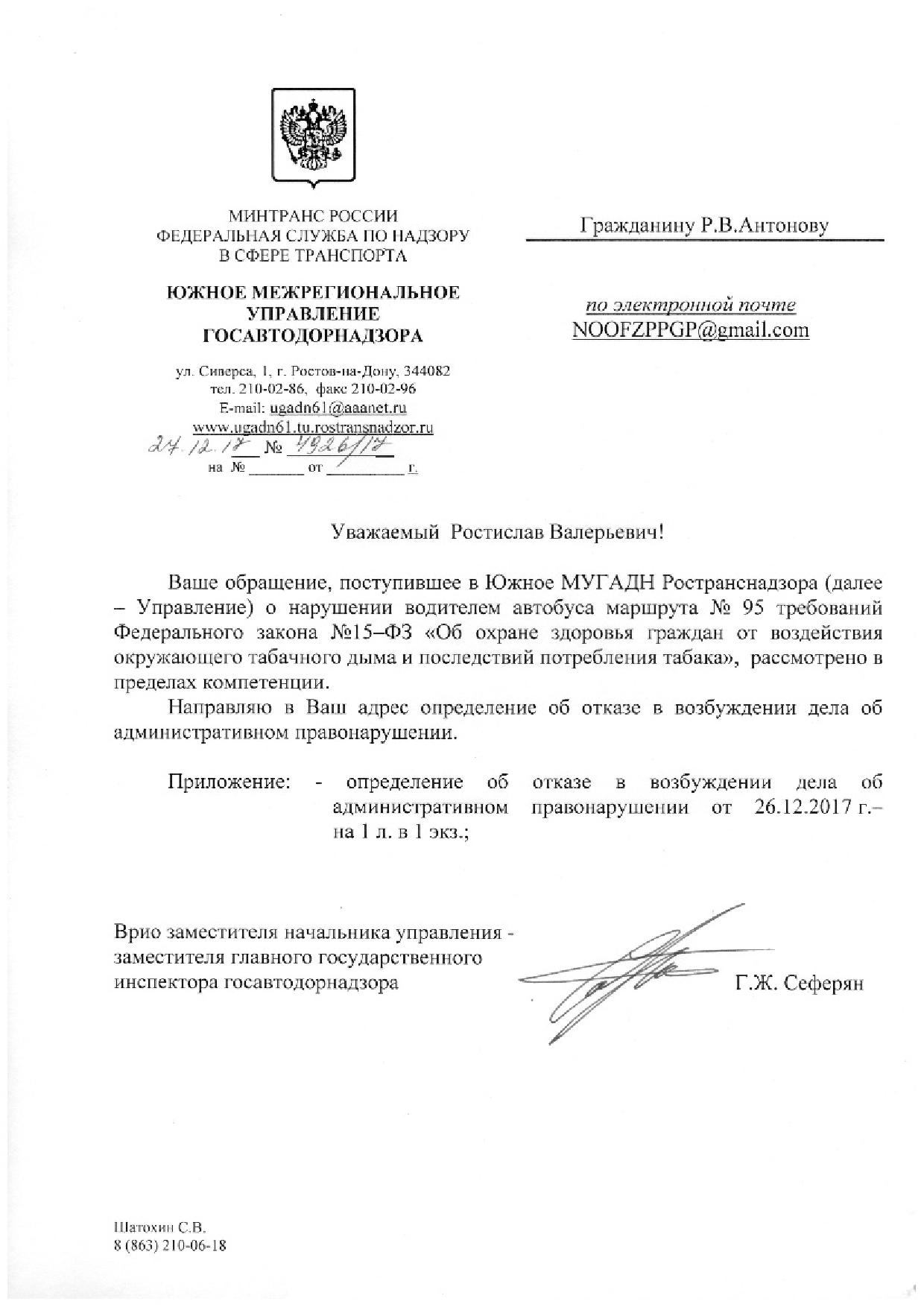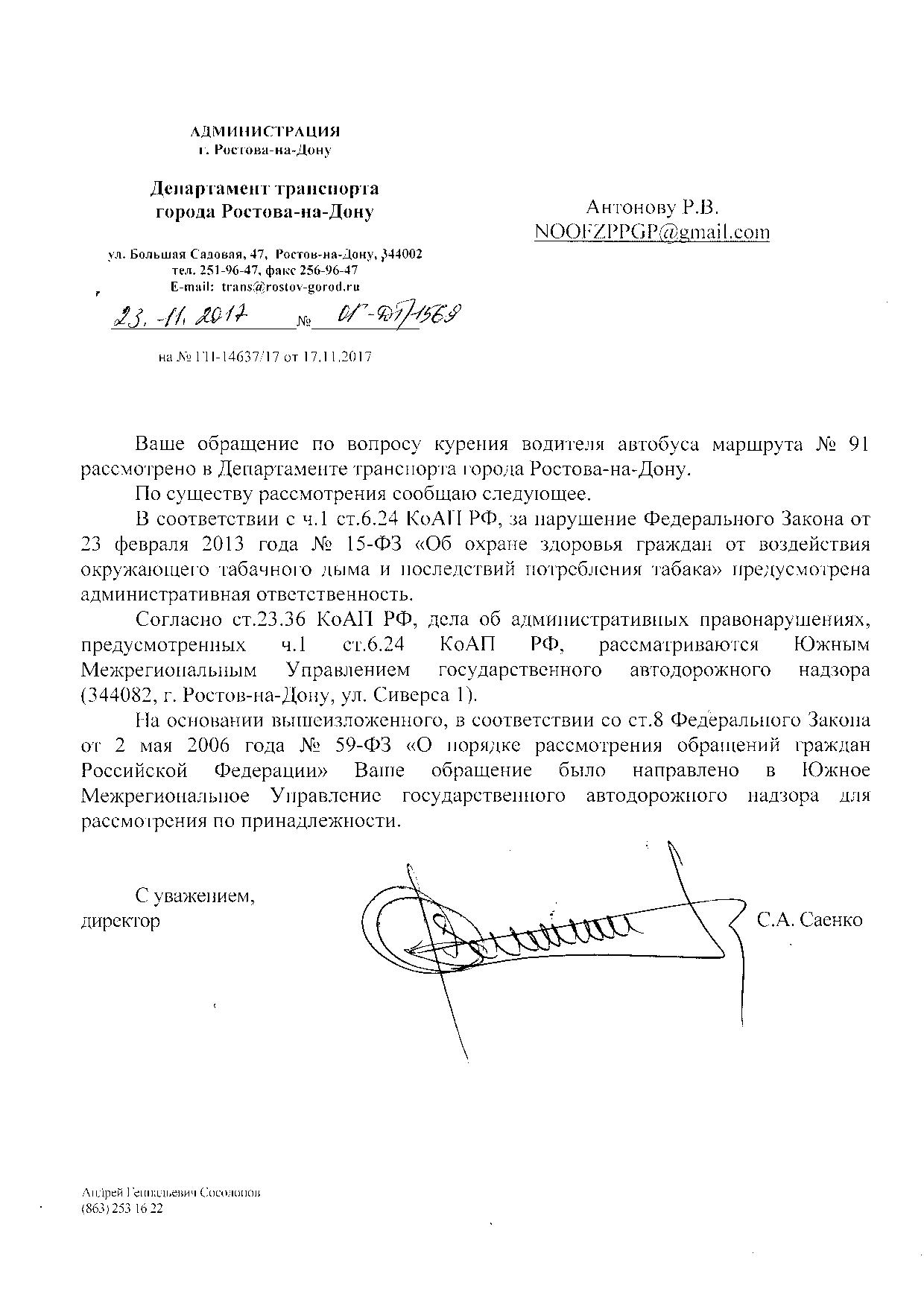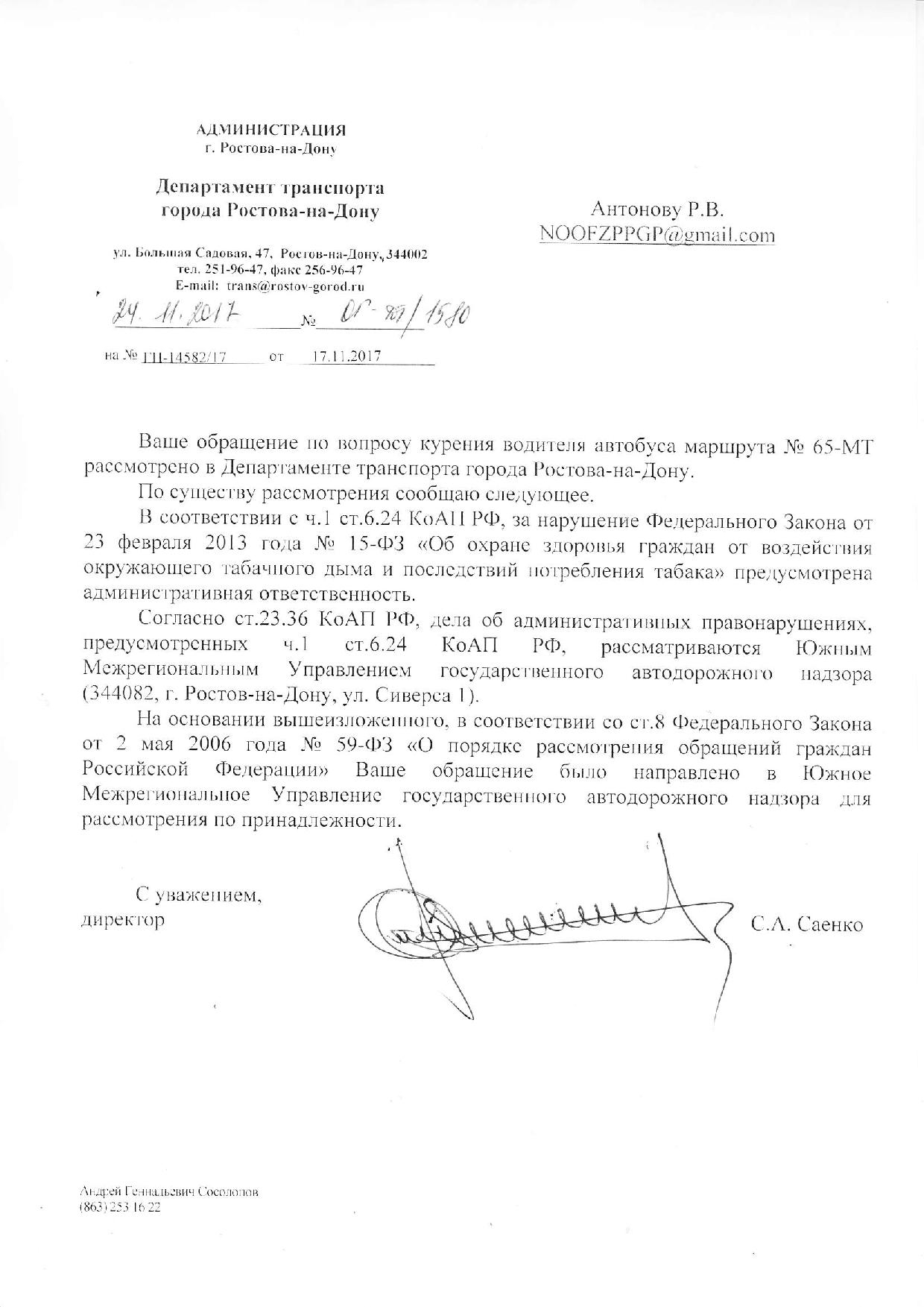 Номер жалобы:26969 Тип жалобы:Прочее Название объекта:Департамент транспорта г.Ростов-на-Дону Город:Ростов-на-Дону Адрес:Площадь Гагарина 1 Описание жалобы:Дата и время нарушения 08.11.2017 13:30