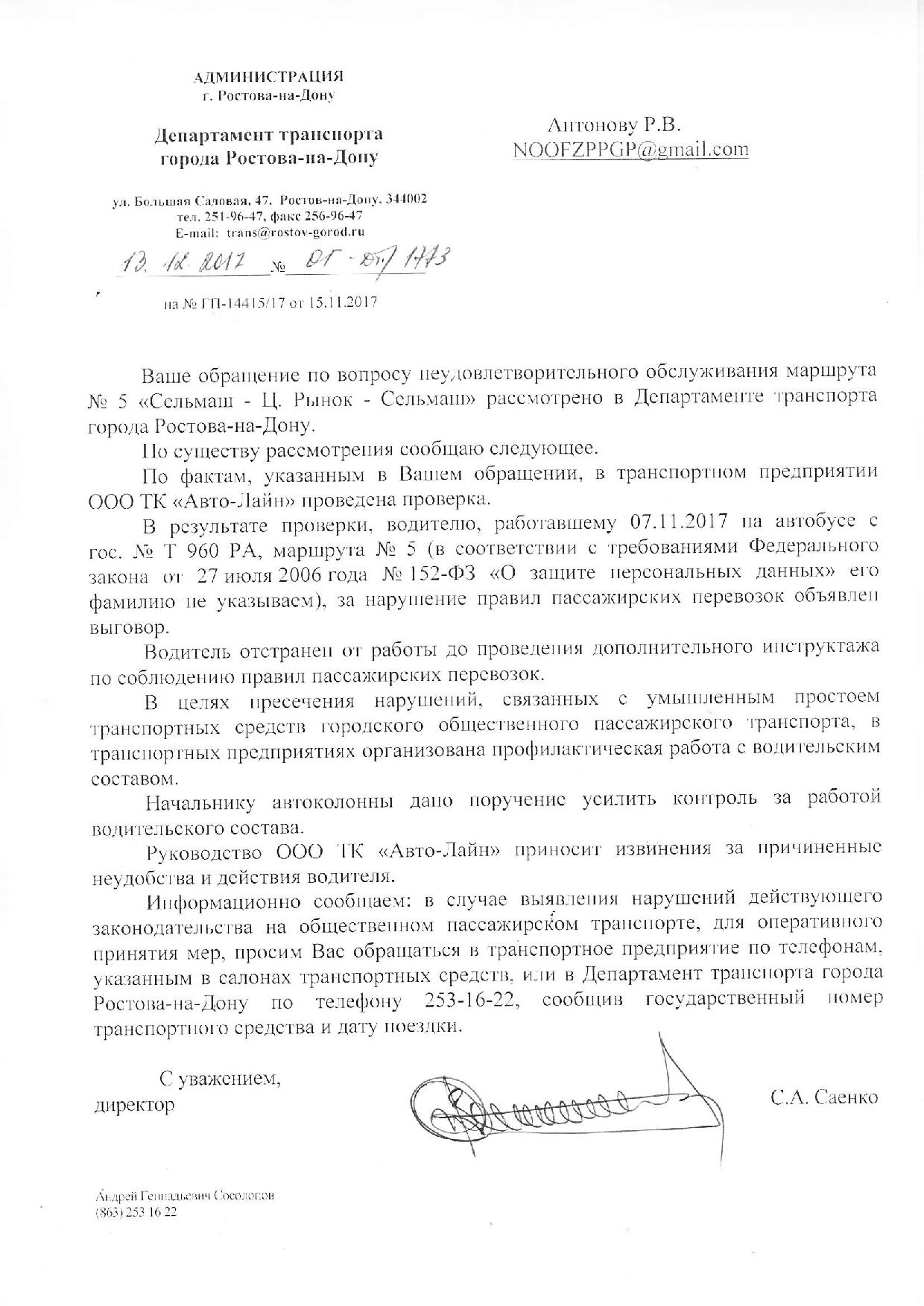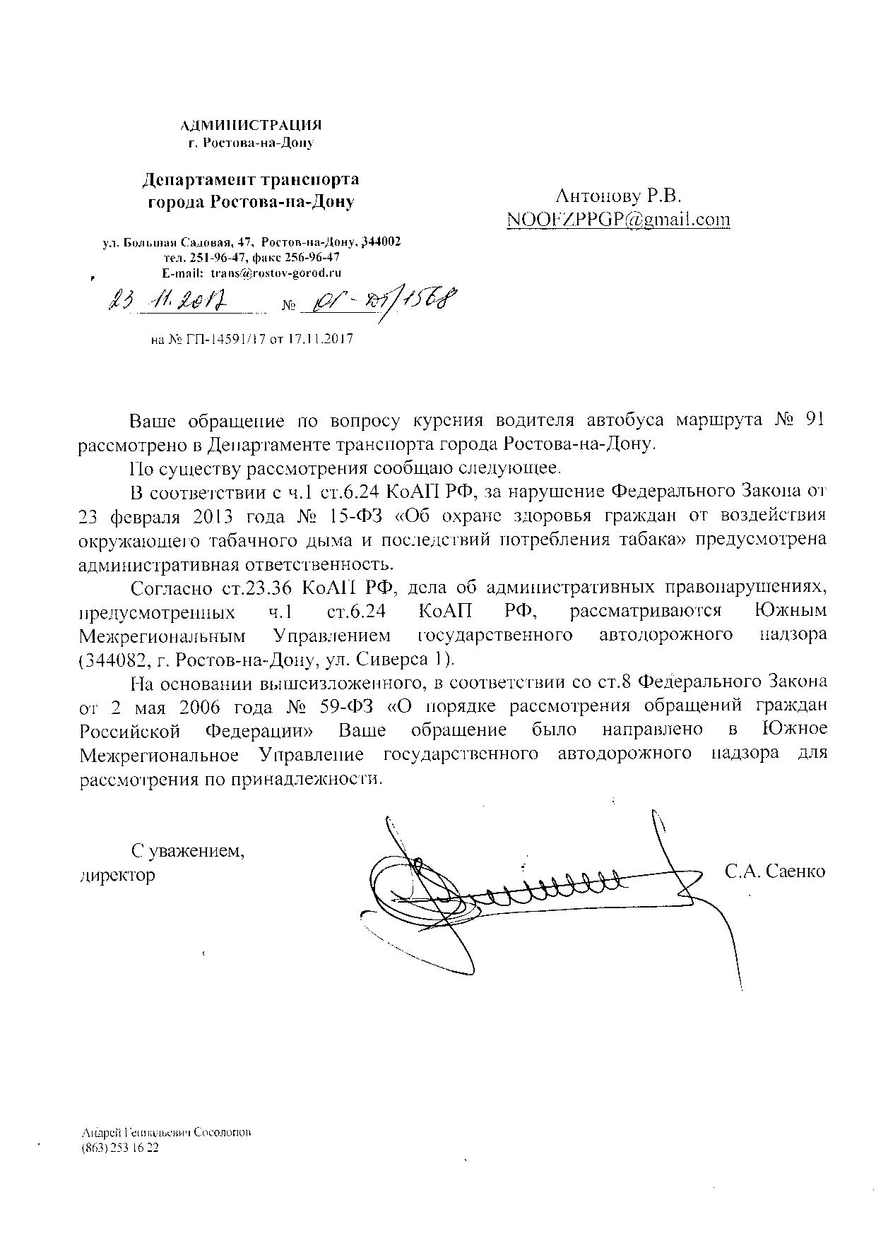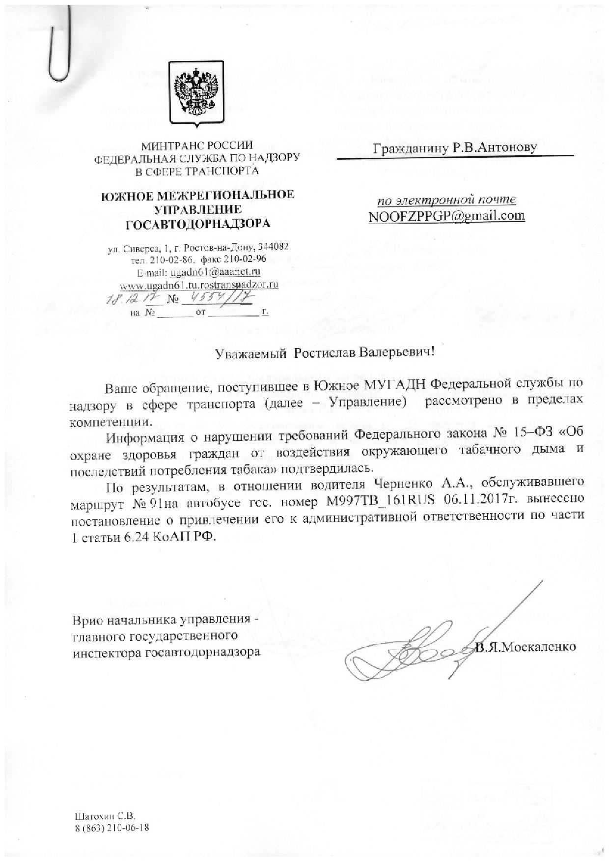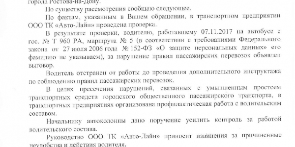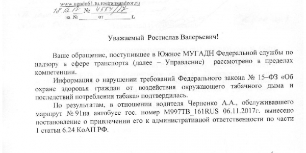 Номер жалобы:26963 Тип жалобы:Прочее Название объекта:Департамент транспорта г.Ростов-на-Дону Город:Ростов-на-Дону Адрес:29 линия и пр-т 40 летия победы, конечная (отстойник Описание жалобы:Дата и время нарушения 07.11.2017 14:20