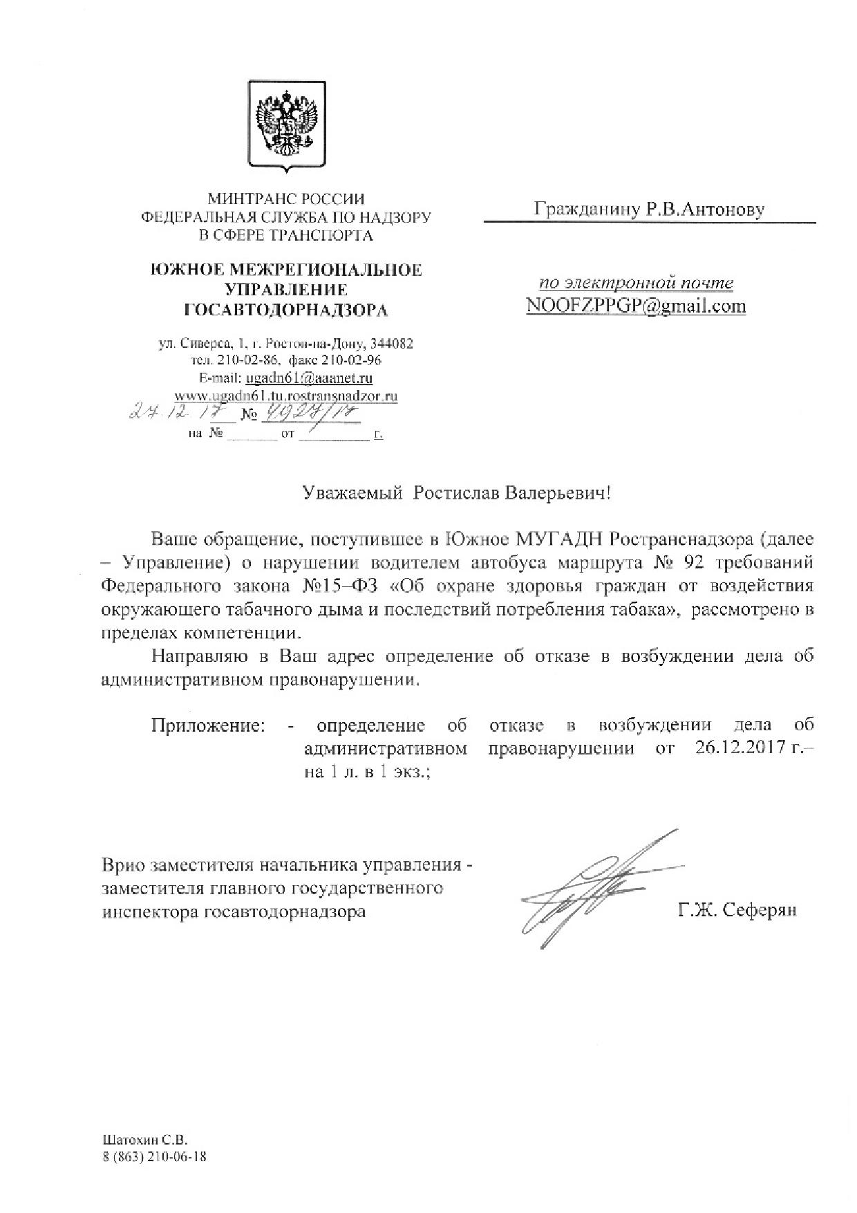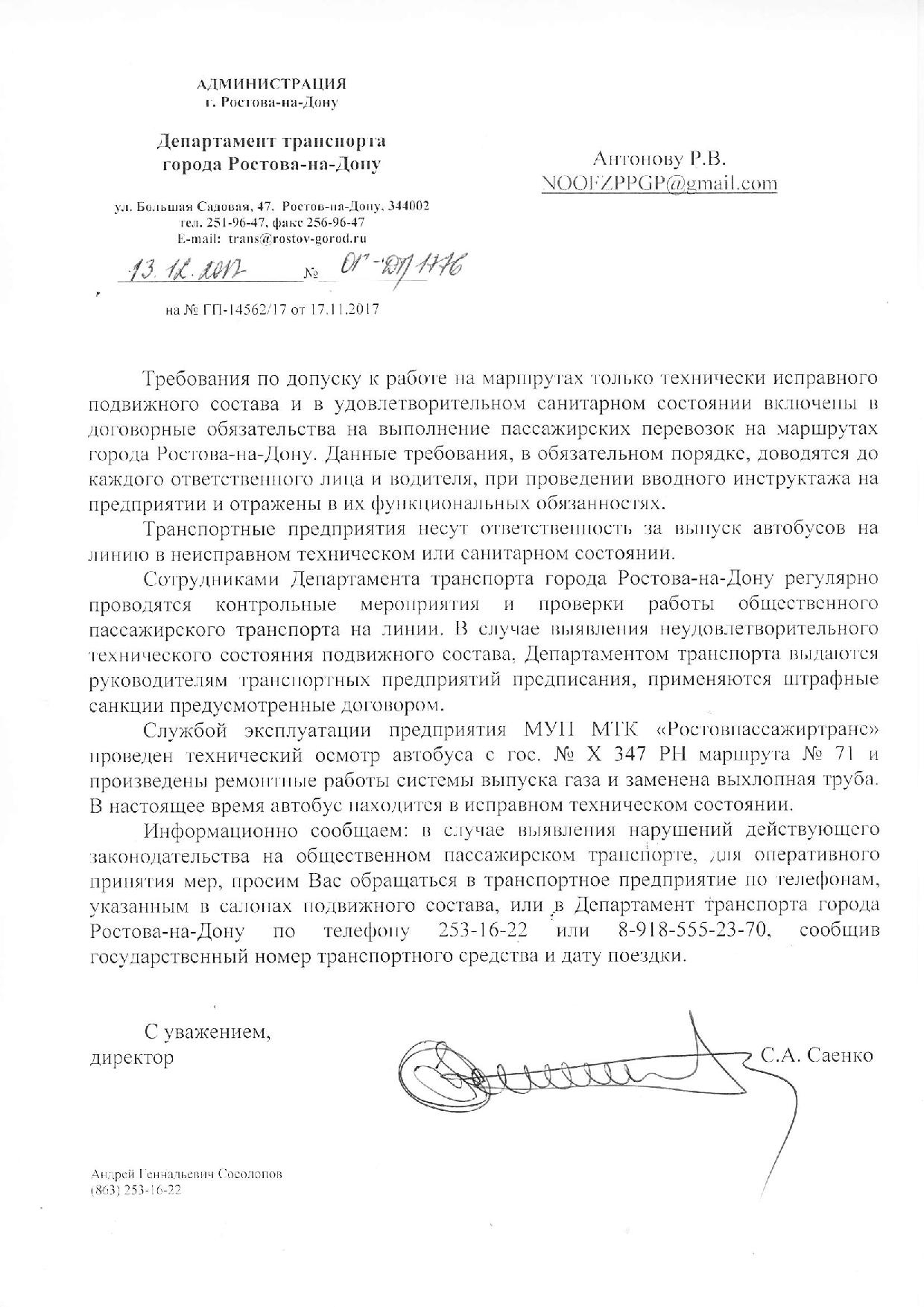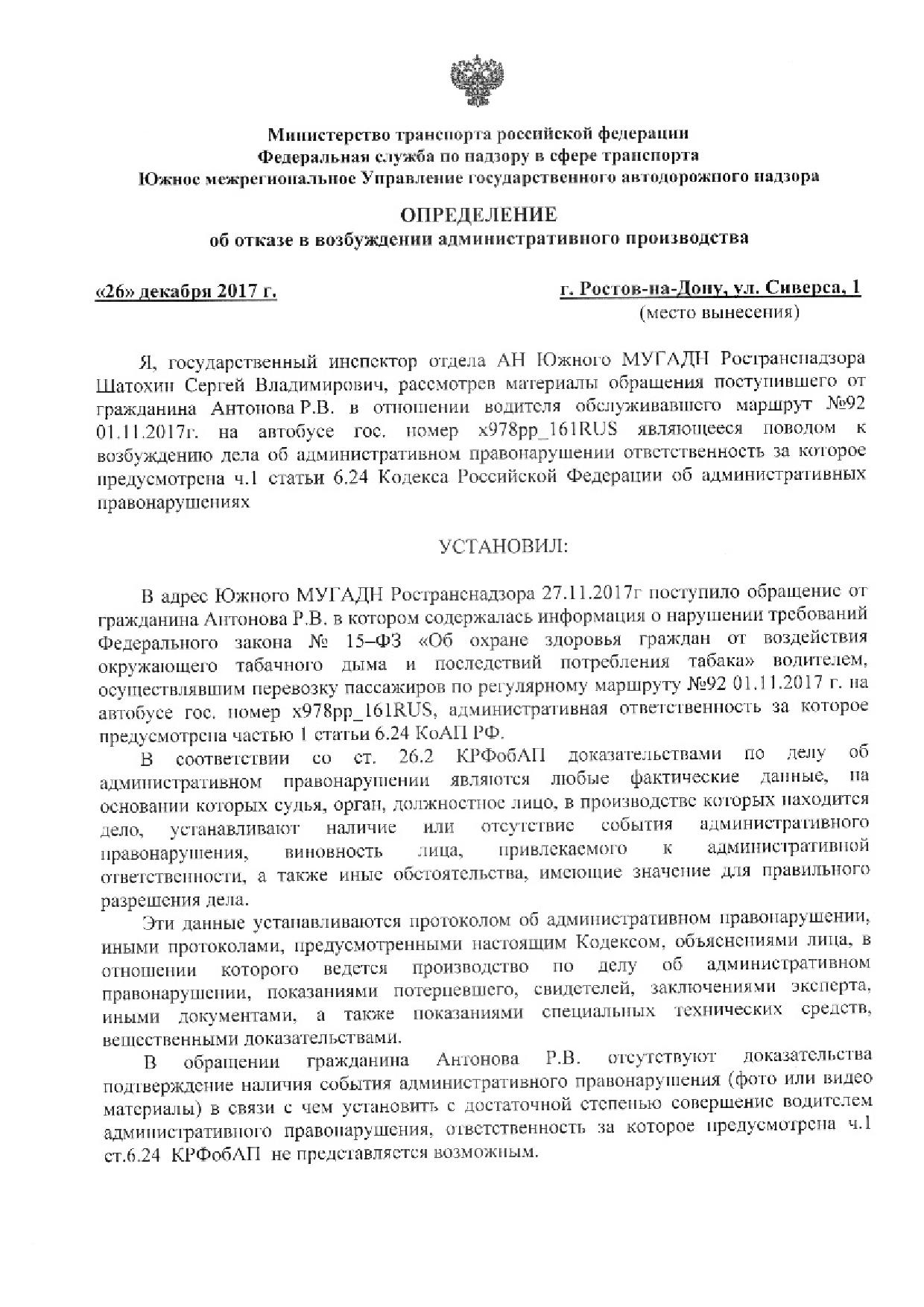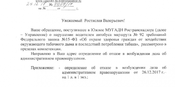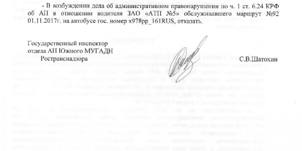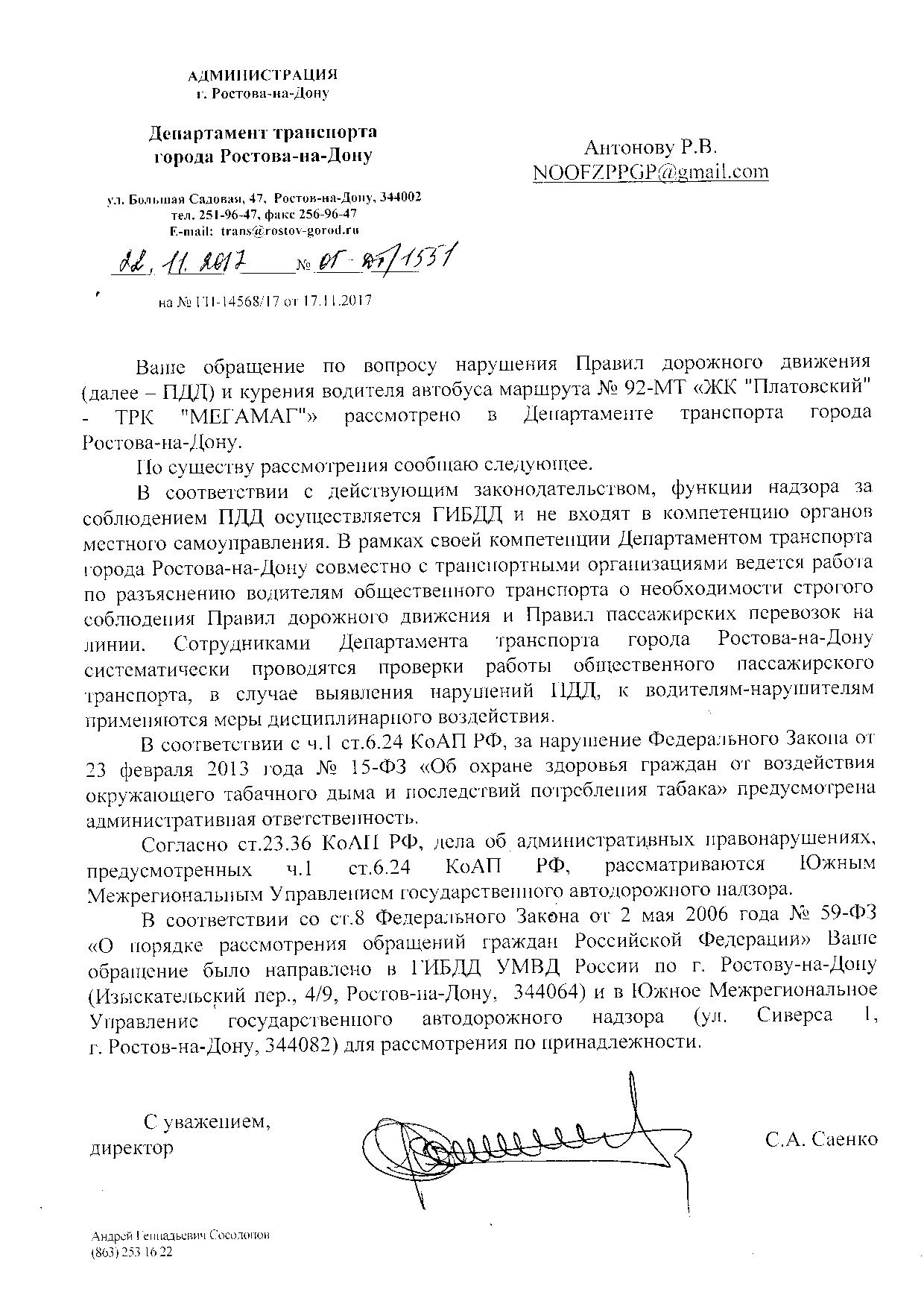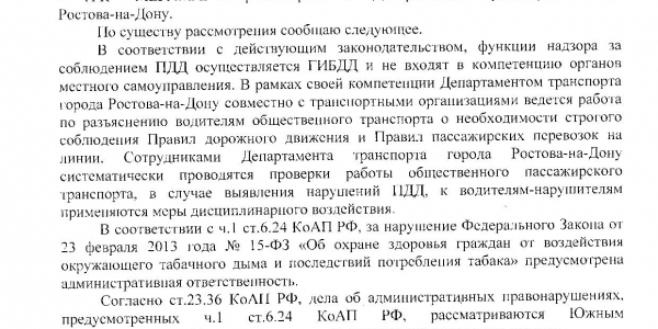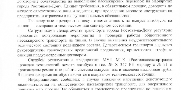 Номер жалобы:26932 Тип жалобы:Прочее Название объекта:Департамент транспорта г.Ростов-на-Дону Регион:Ростовская область Город:Ростов-на-Дону Адрес:По маршруту Описание жалобы:ата и время нарушения 02.11.2017 07:21