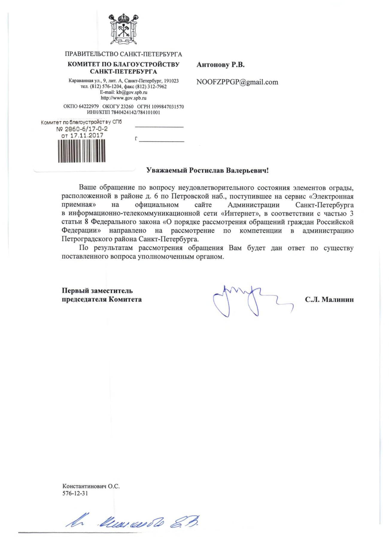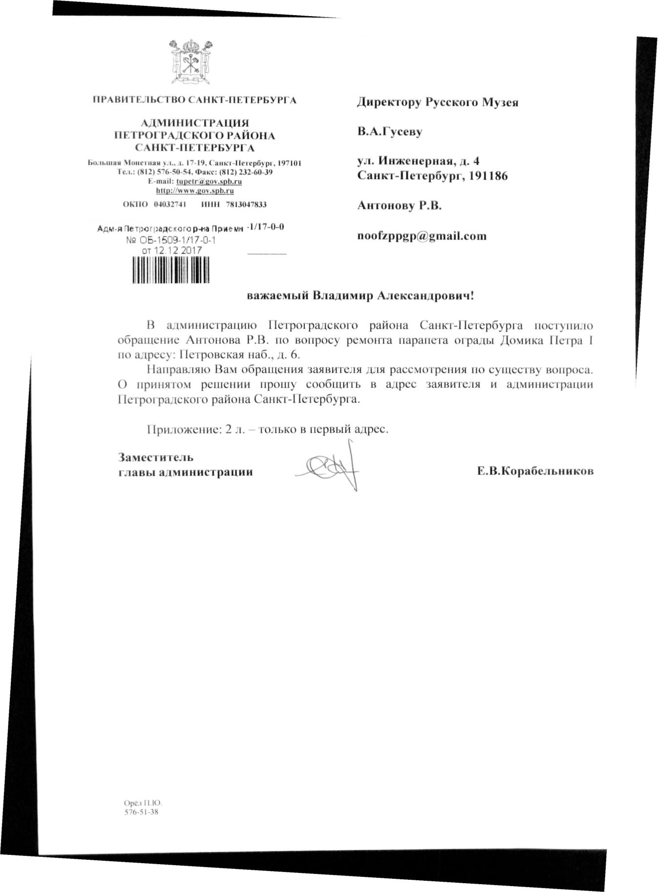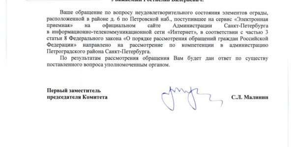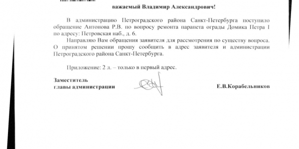 Номер жалобы:26838 Тип жалобы:Прочее Название объекта:Районная Администрация Город:Санкт-Петербург Адрес:Санкт-Петербург, Петровская набережная, 6 Описание жалобы:Комментарий Статус: