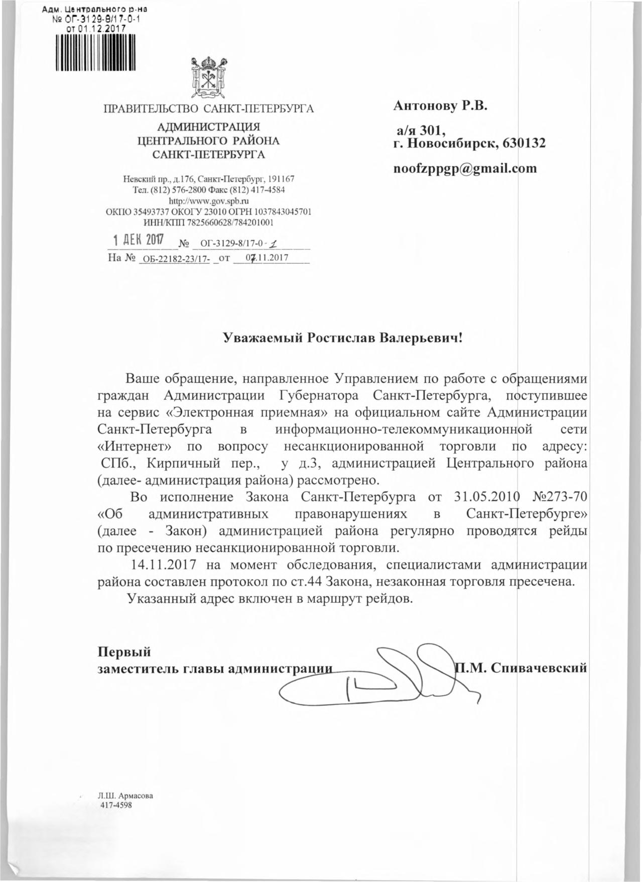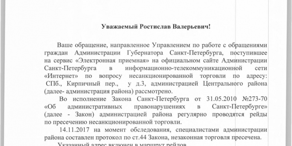 Номер жалобы:26433 Тип жалобы:Прочее Название объекта:Районная Администрация Город:Санкт-Петербург Адрес:Санкт-Петербург, Кирпичный переулок, 2 Описание жалобы:Нелегальная торговля Статус: