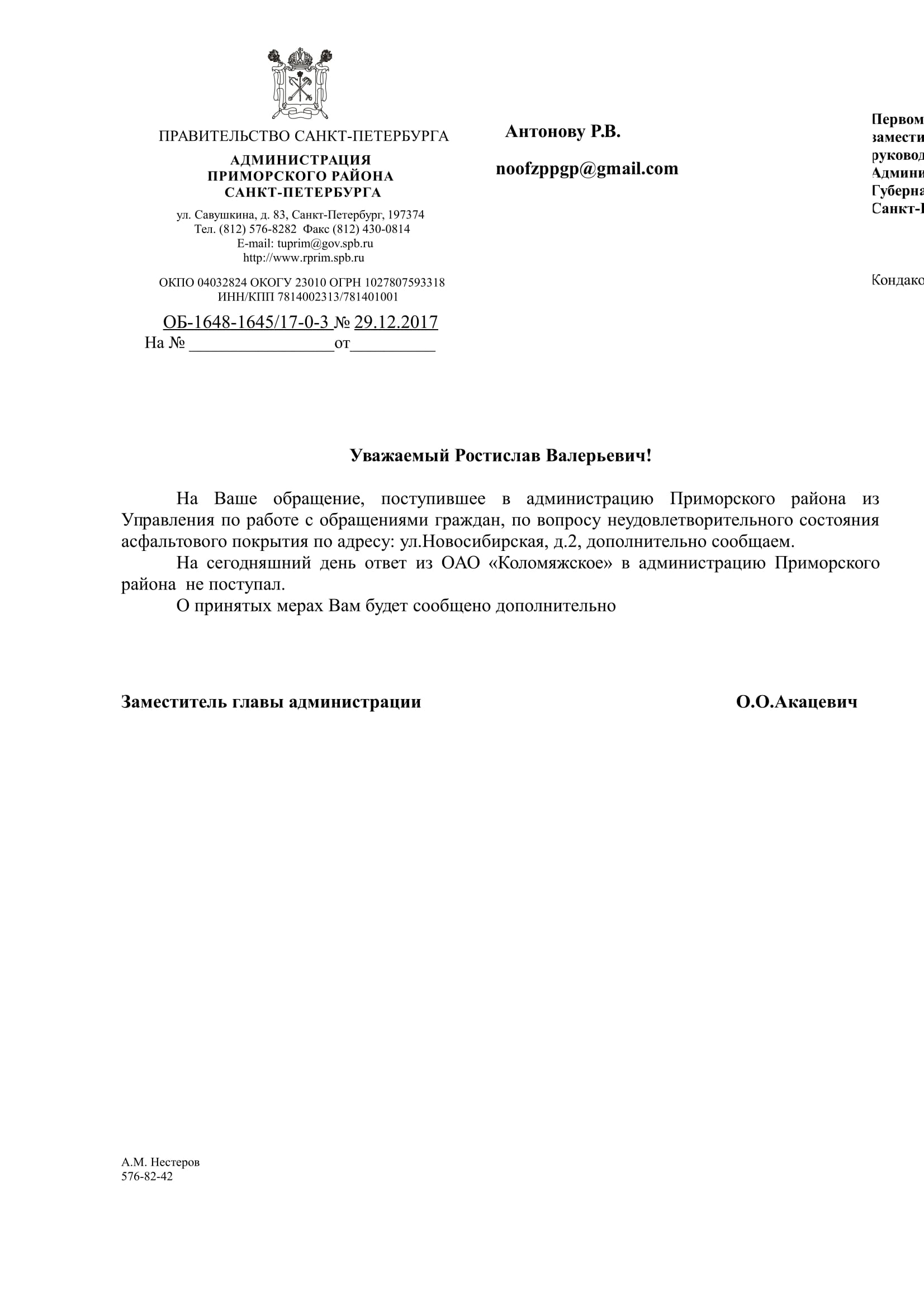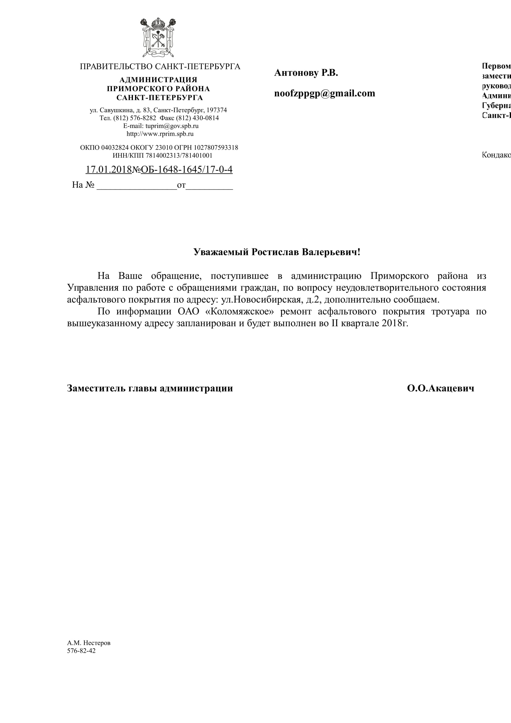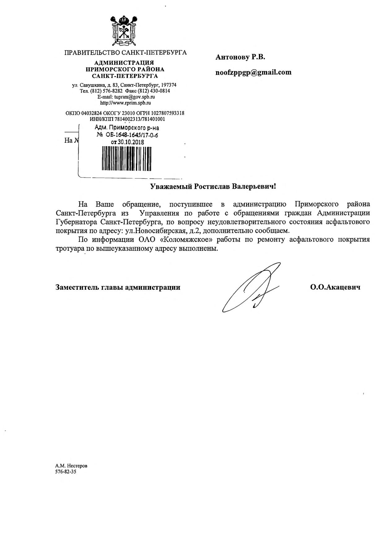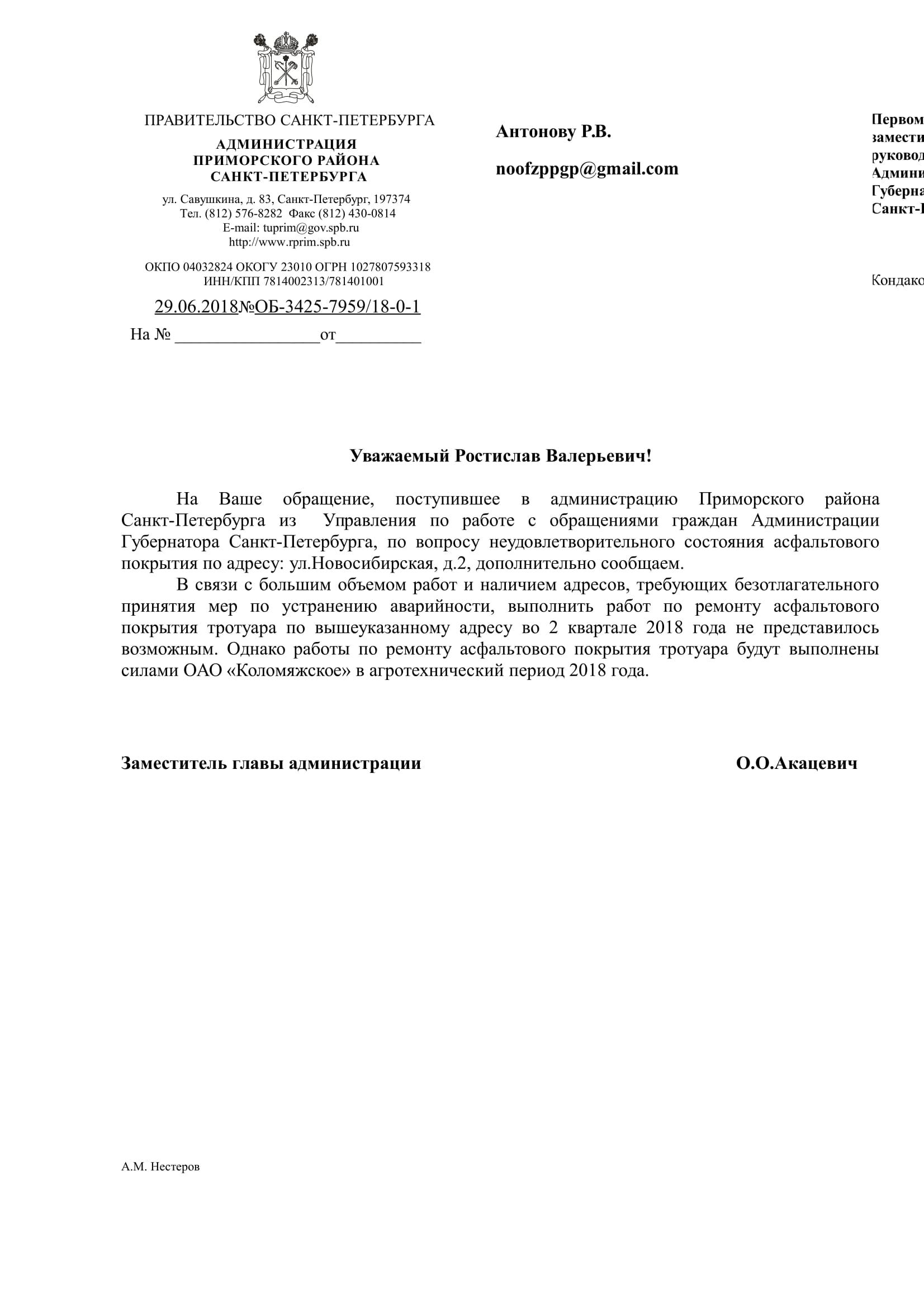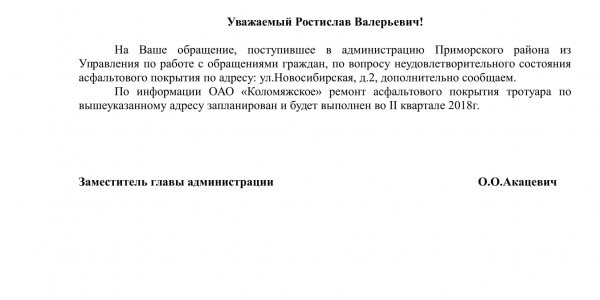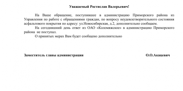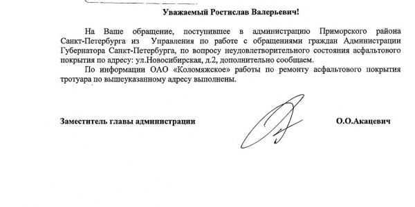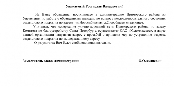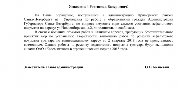 Номер жалобы:26437 Тип жалобы:Прочее Название объекта:Районная Администрация Город:Санкт-Петербург Адрес:Санкт-Петербург, Новосибирская улица, 2 Описание жалобы:Асфальт Статус: