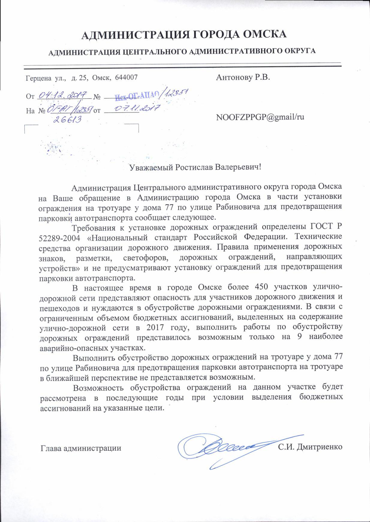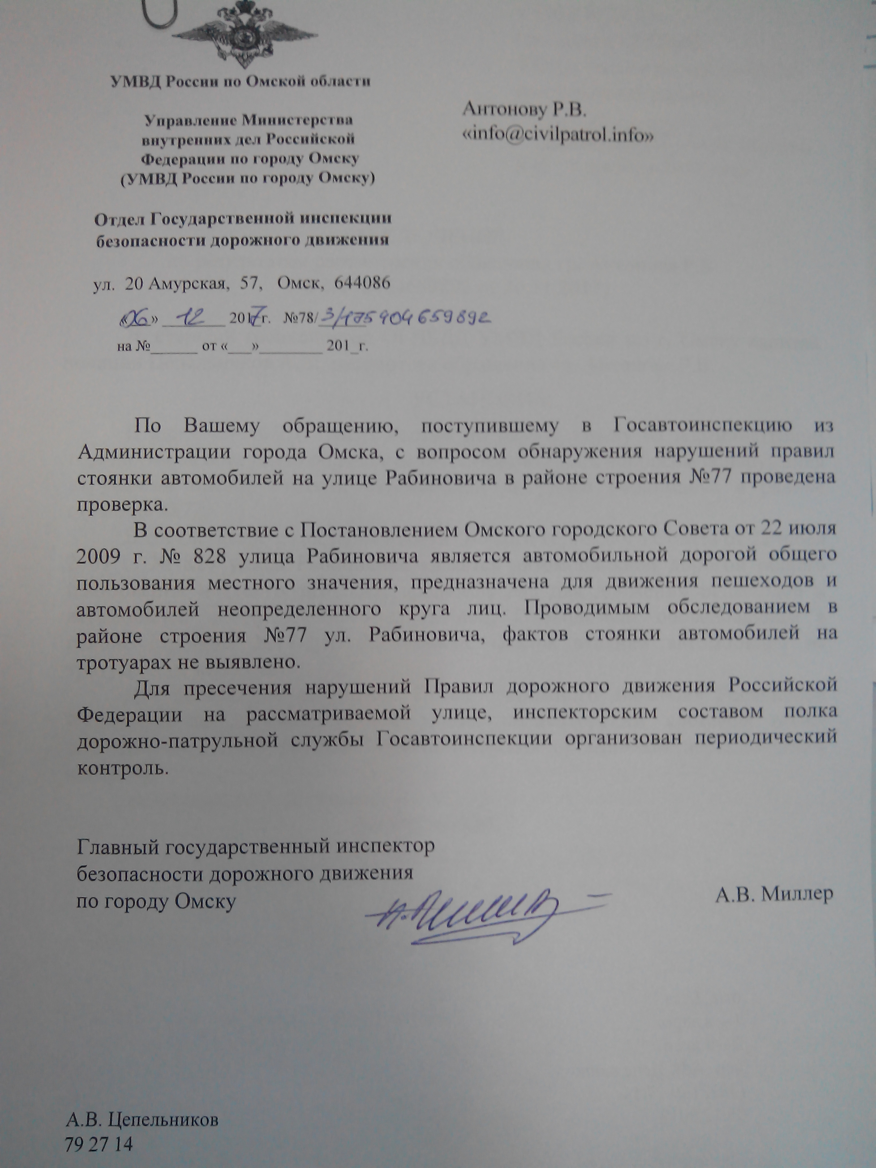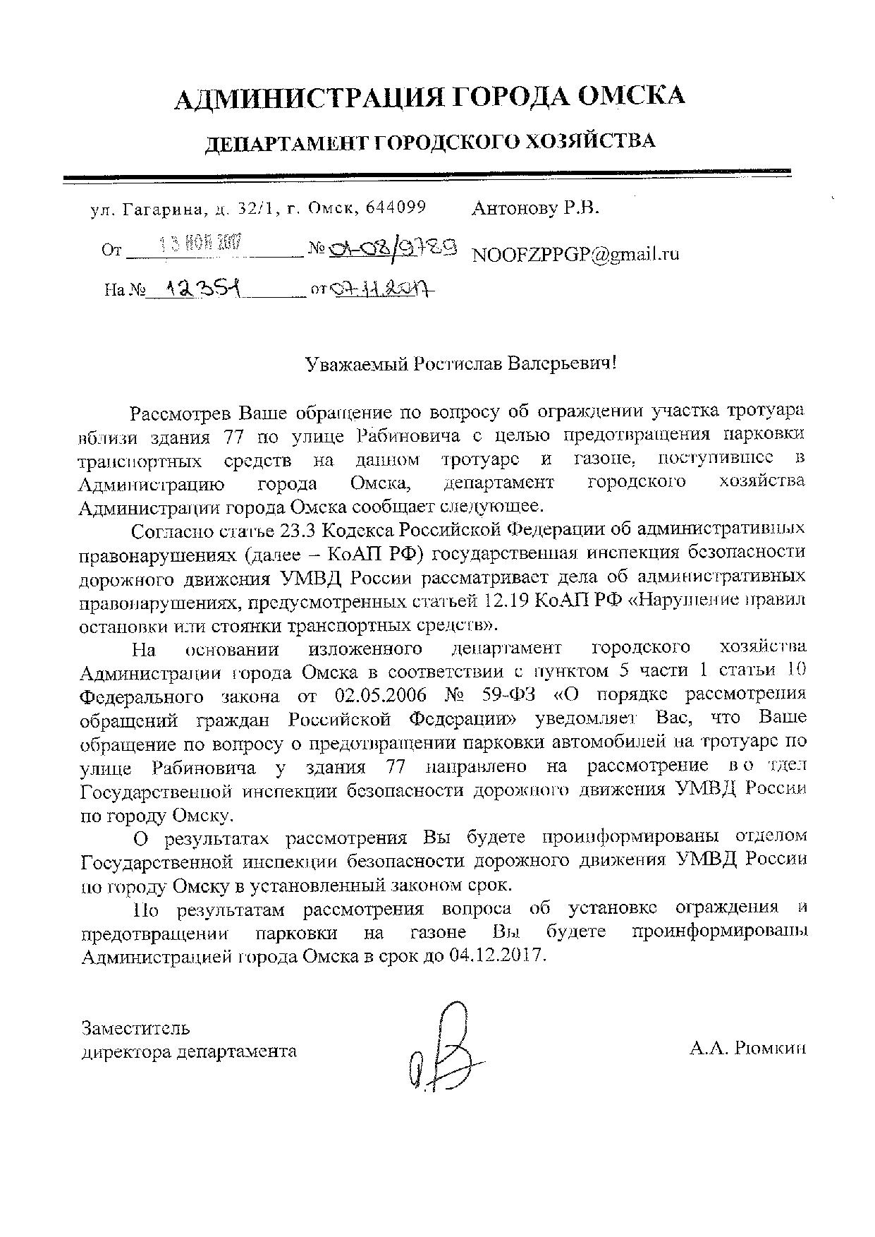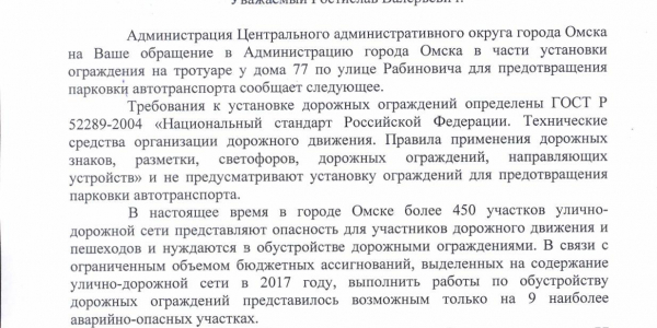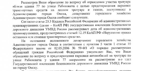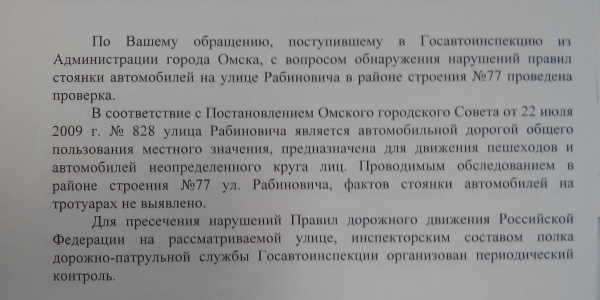 Номер жалобы:26613 Тип жалобы:Прочее Название объекта:ГИБДД МВД России по городу Омску Город:Омск Адрес:Омск, улица Рабиновича, 77 Описание жалобы:Парковка на тротуаре легкового автомобиля Статус:
